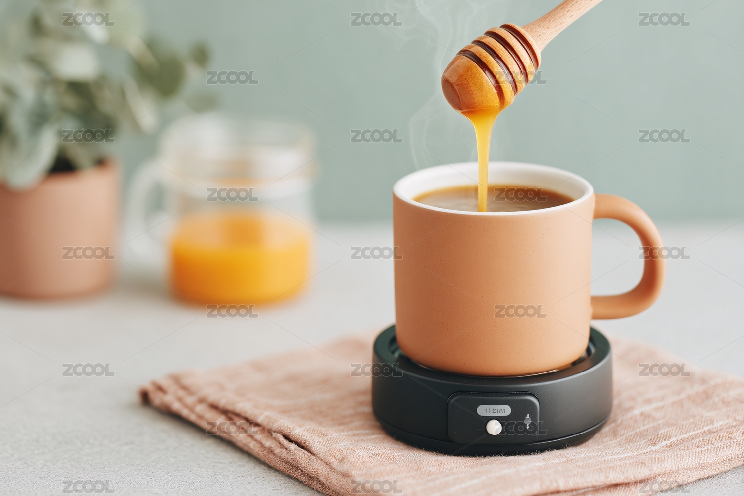 暖杯墊上倒蜂蜜的溫馨咖啡畫面