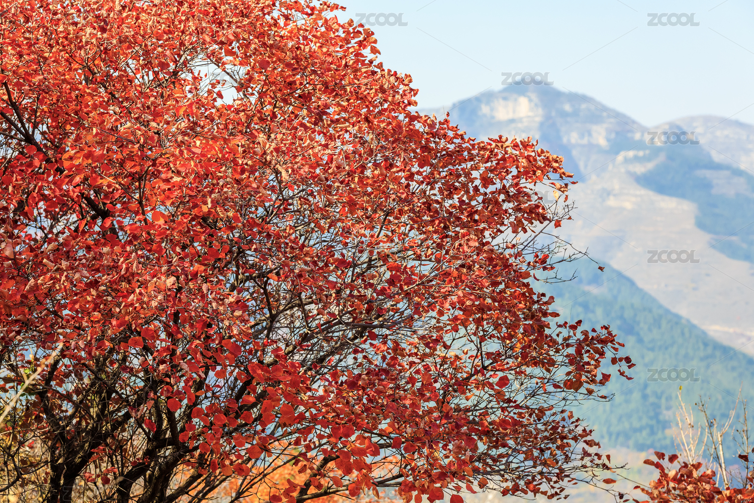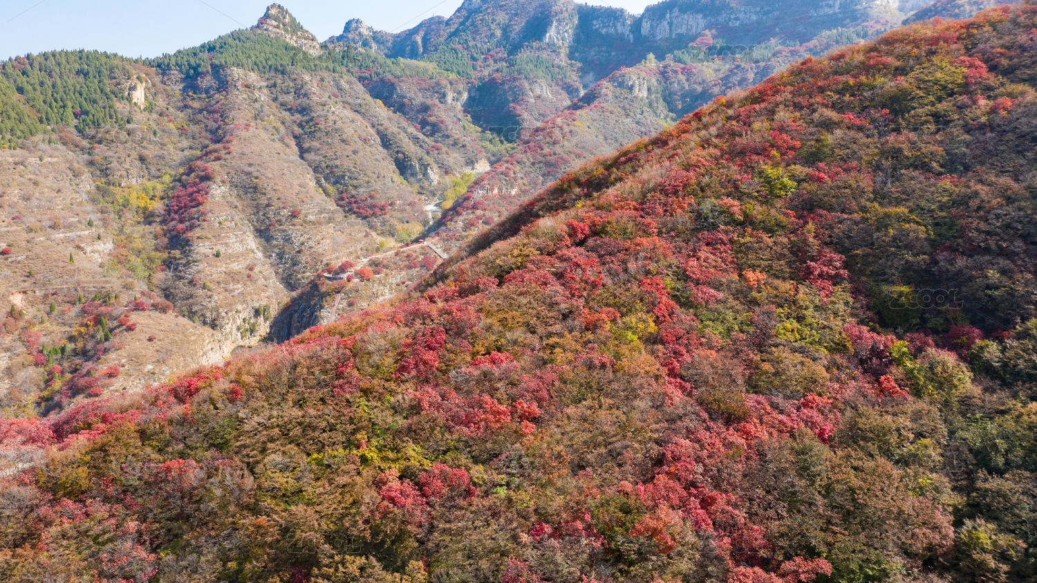 深秋山坡上的紅色黃櫨樹,中國山東省青州市天賜山