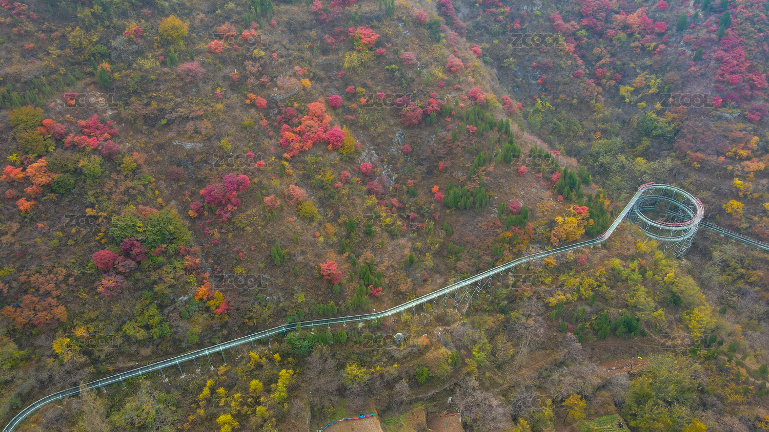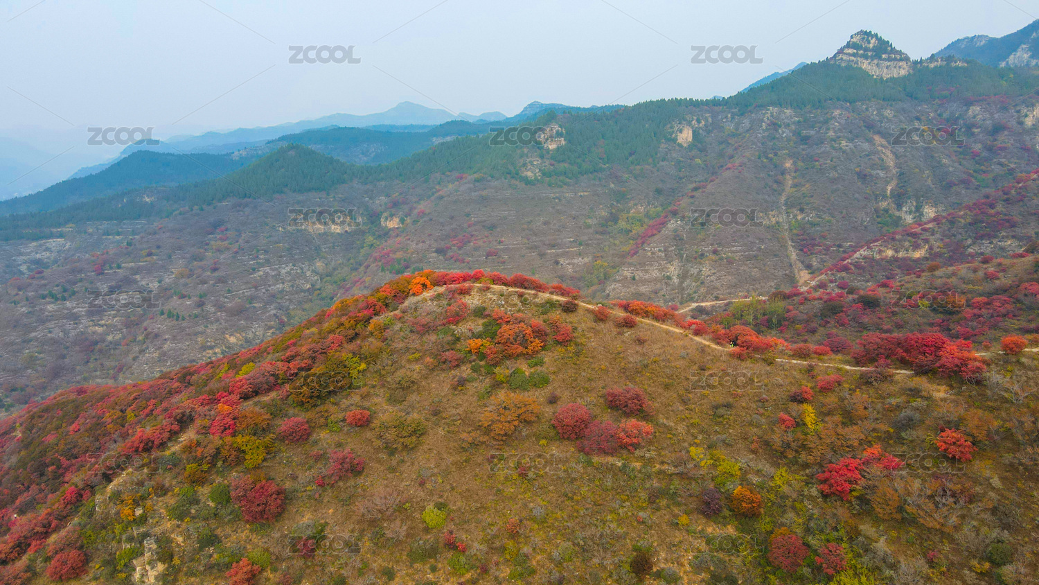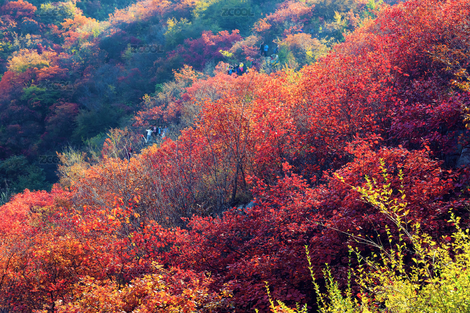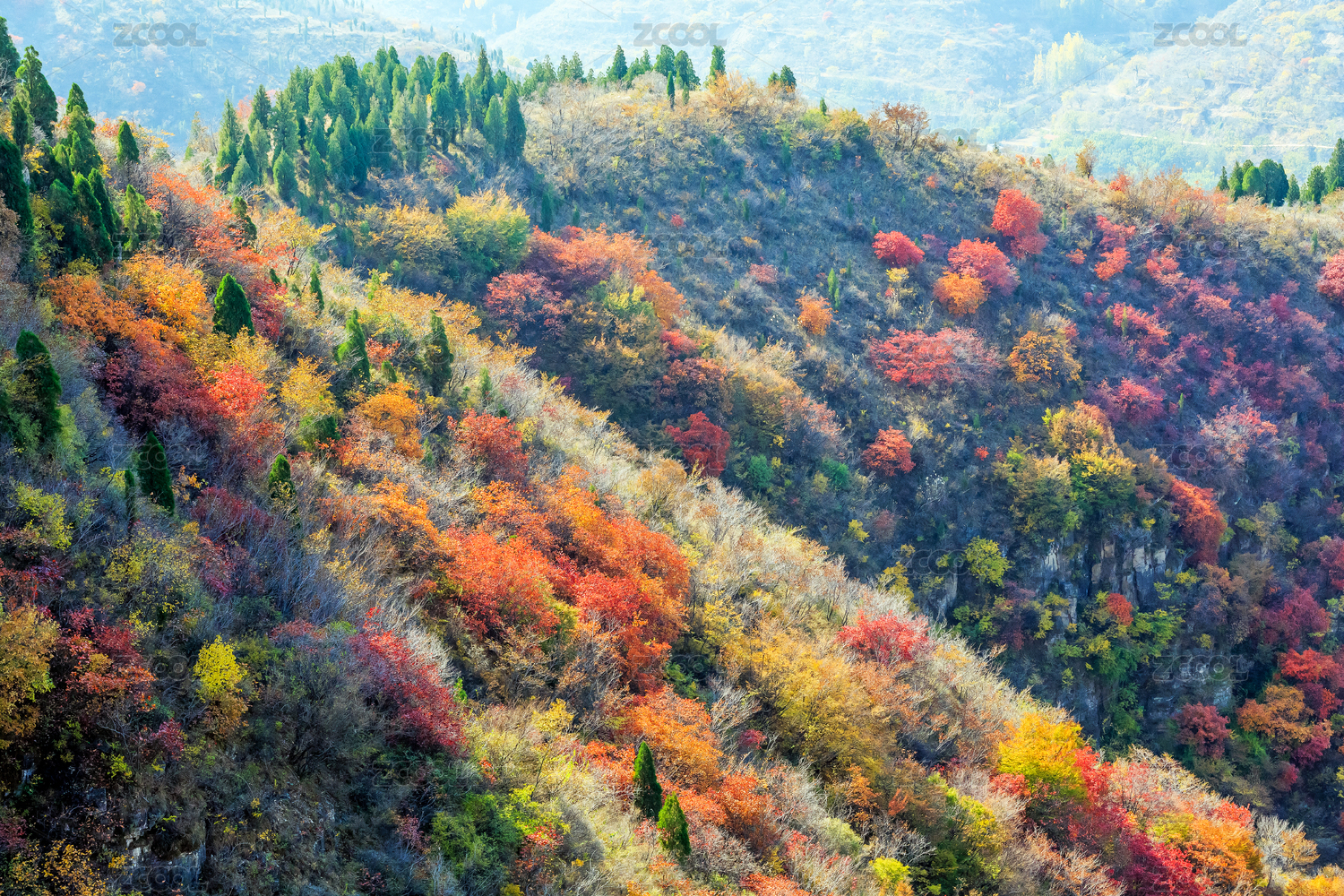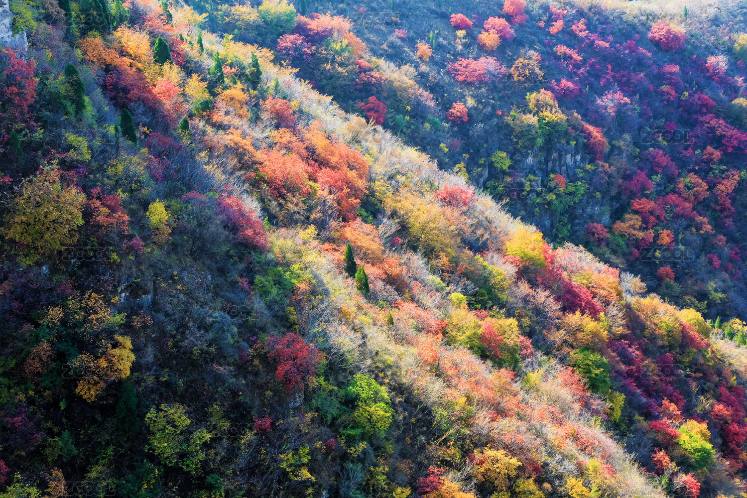 深秋山坡上的彩色灌木林,中國山東省青州市天賜山