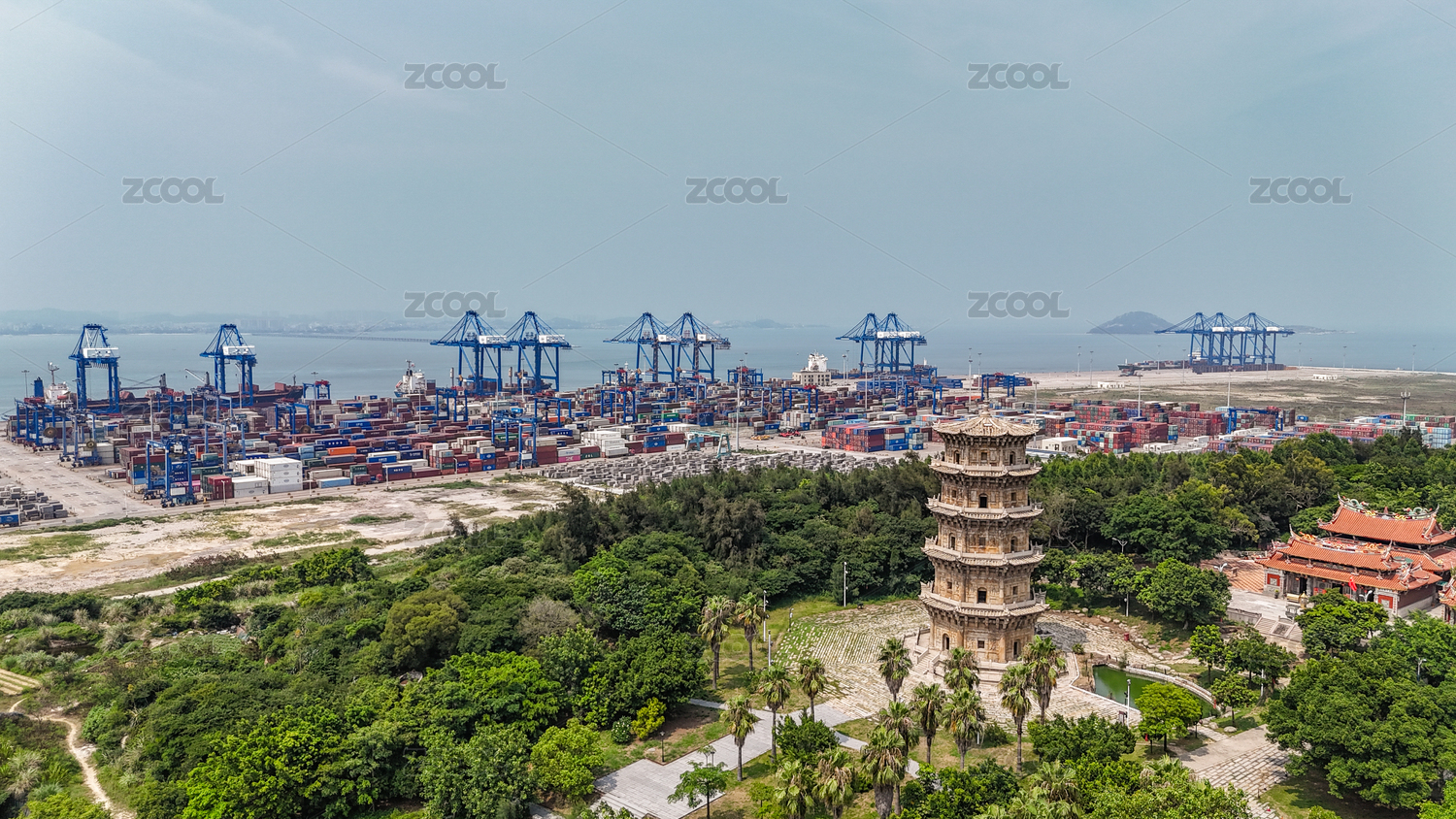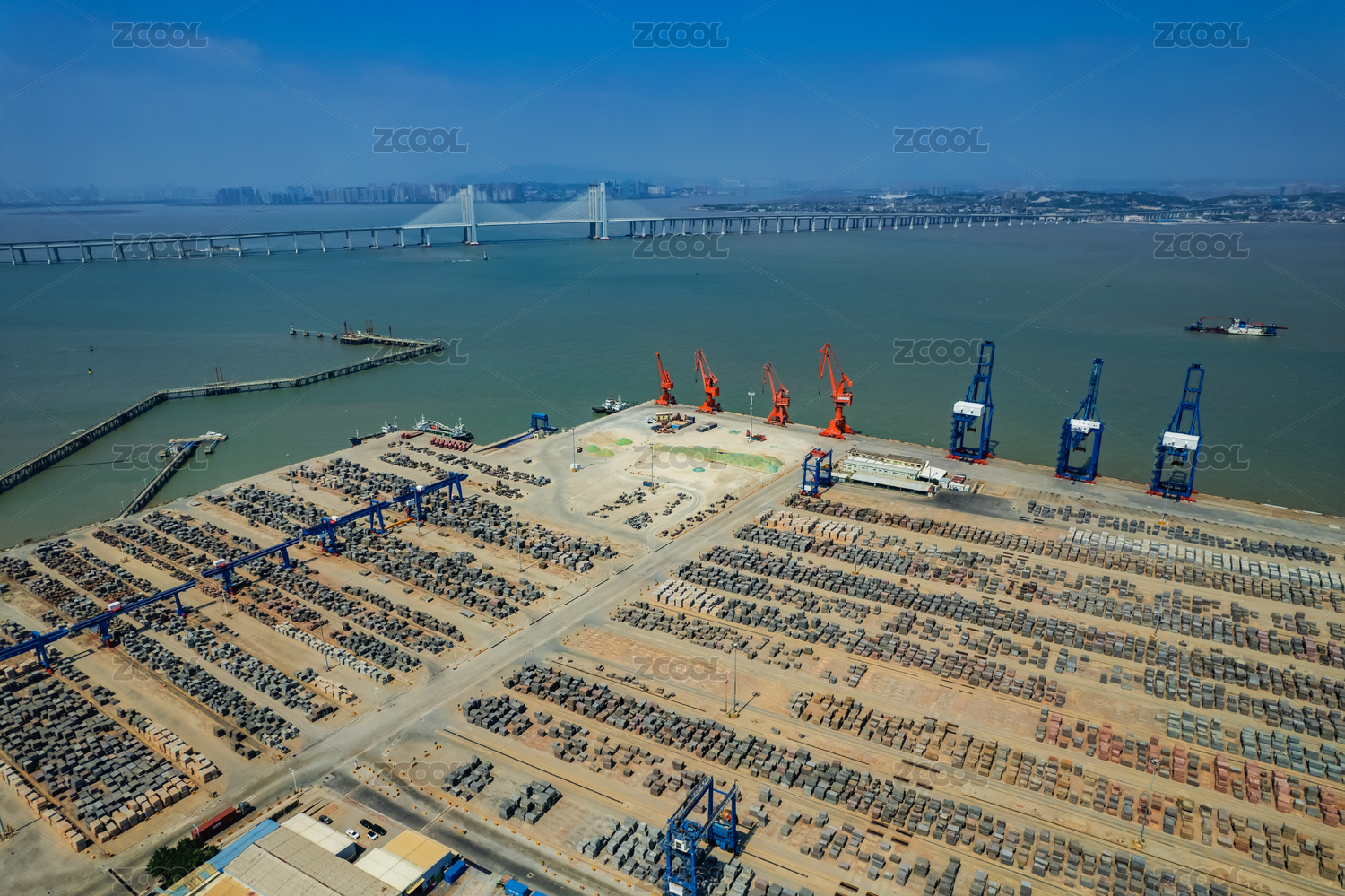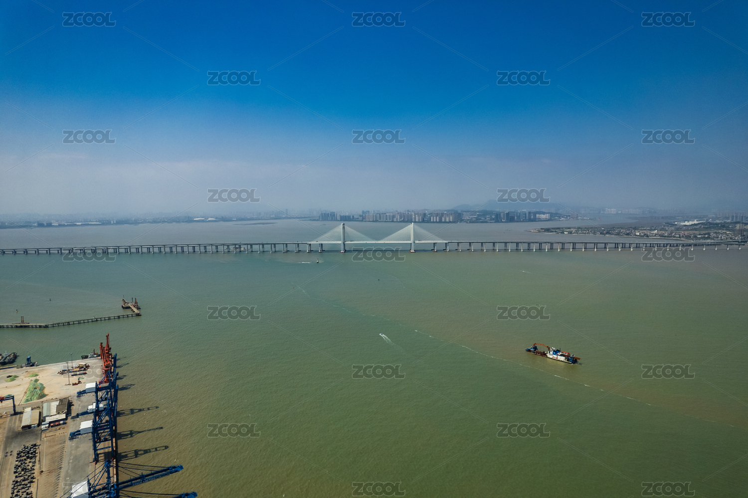 俯瞰福建泉州灣大型集裝箱港口和海灣風景