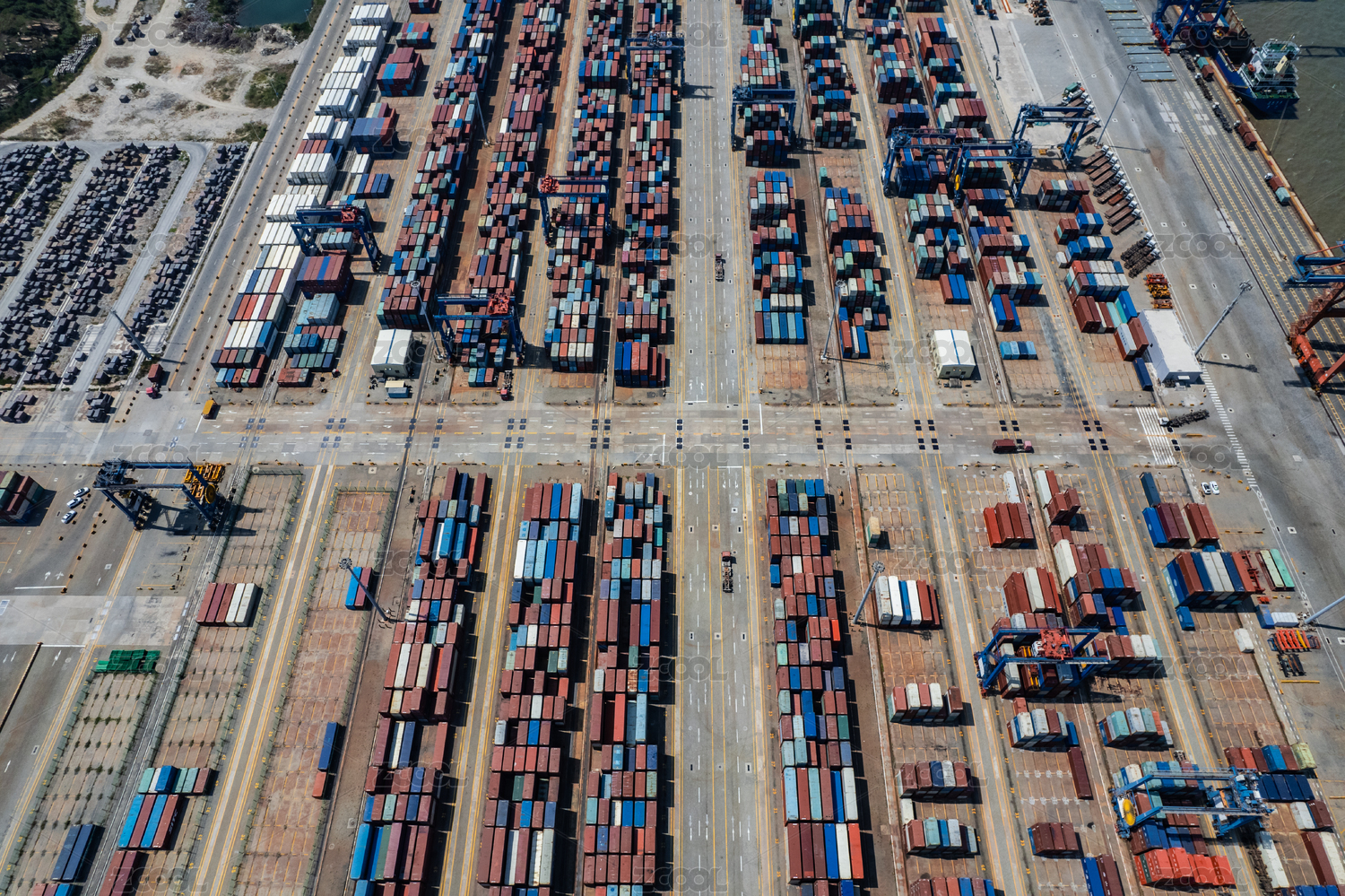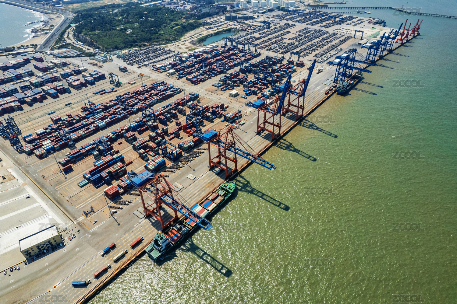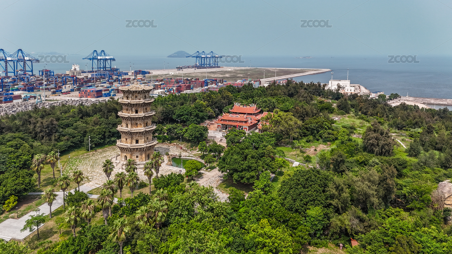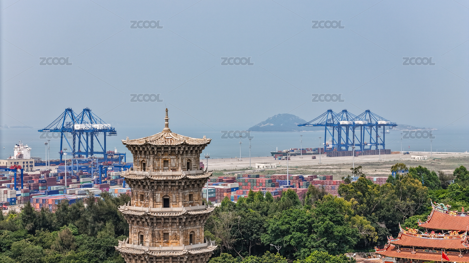 俯瞰福建泉州灣大型集裝箱港口和海灣風景