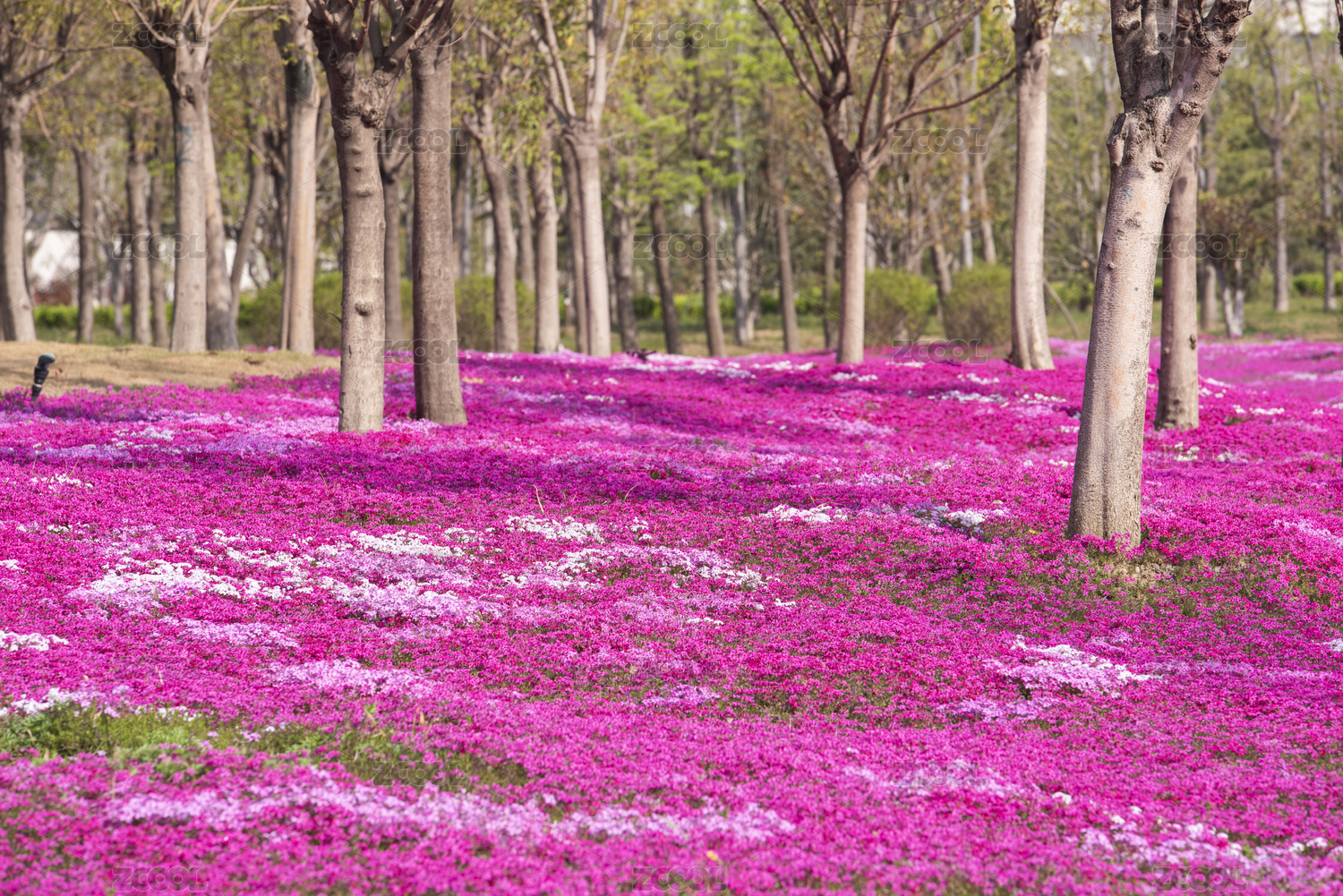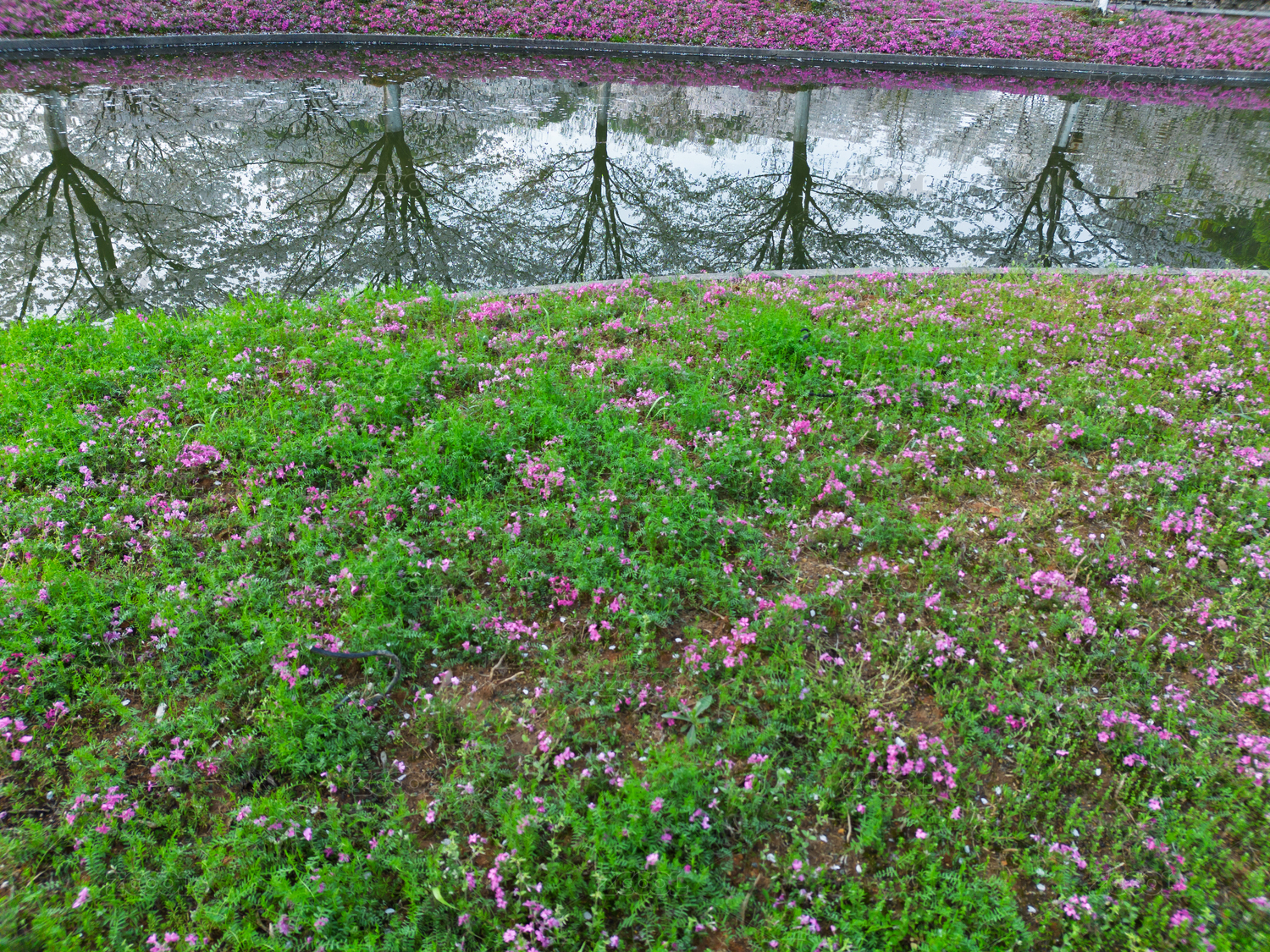 芝櫻花綠意盎然草地水岸倒影園林景觀