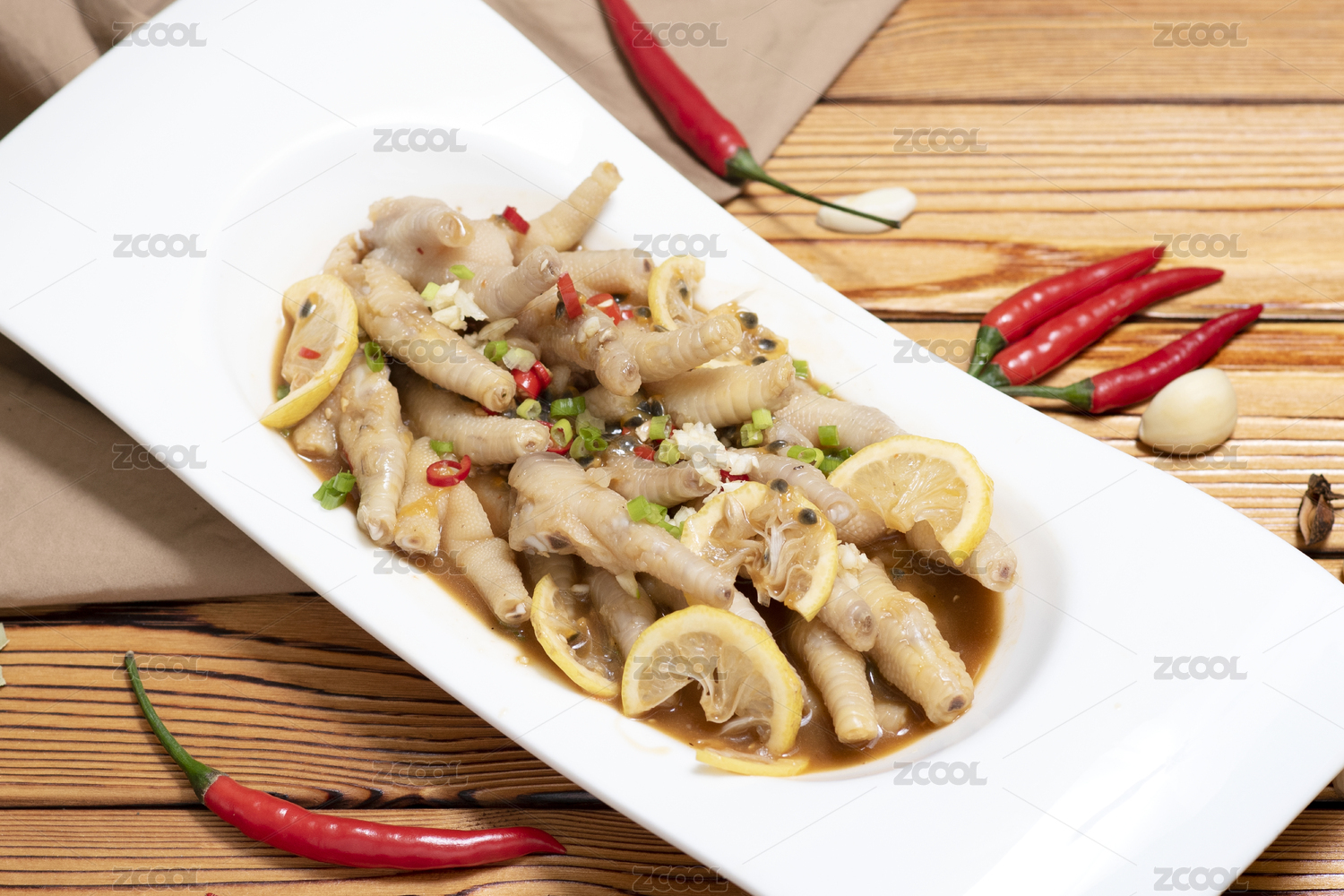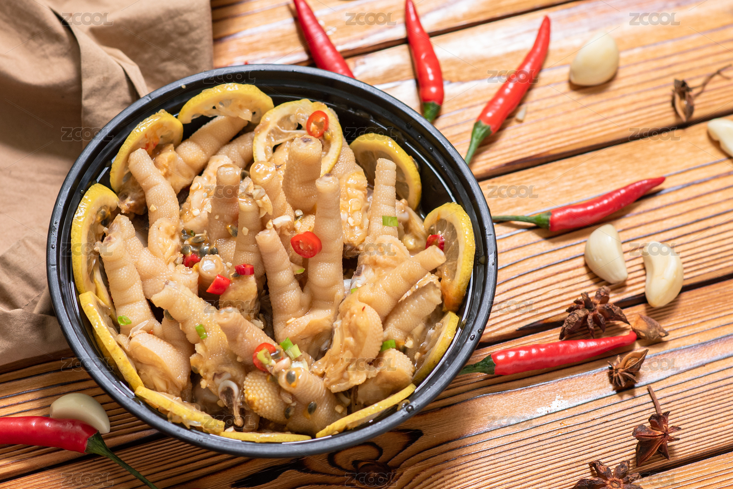 百香果秘制雞爪和一些辣椒蒜瓣擺放在木桌上