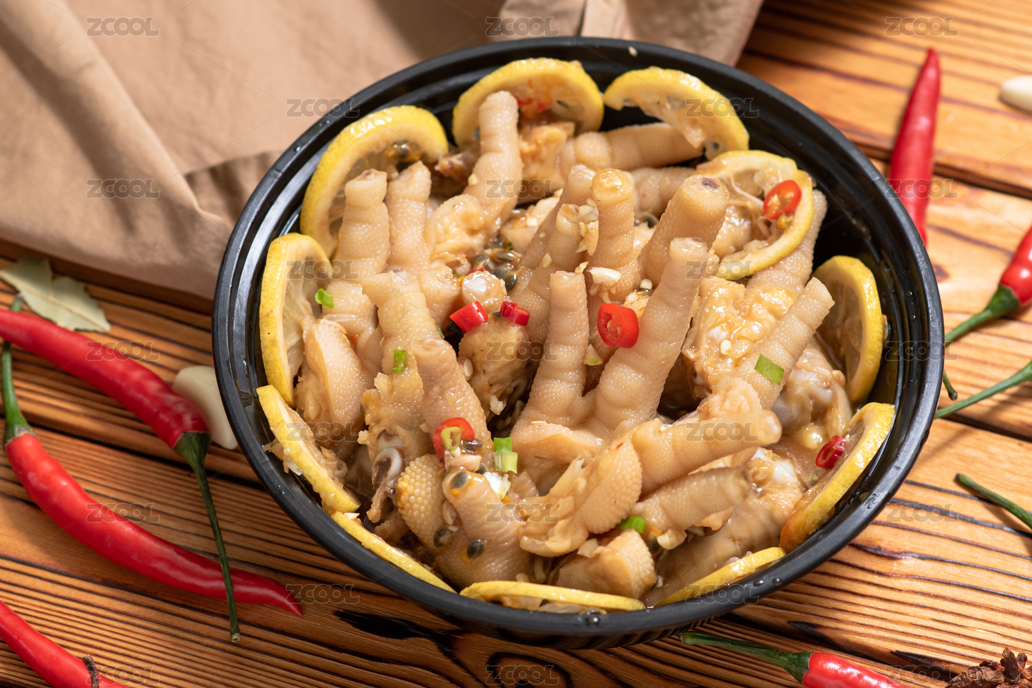 一碗麻辣檸檬百香果秘制雞爪擺放在木桌上