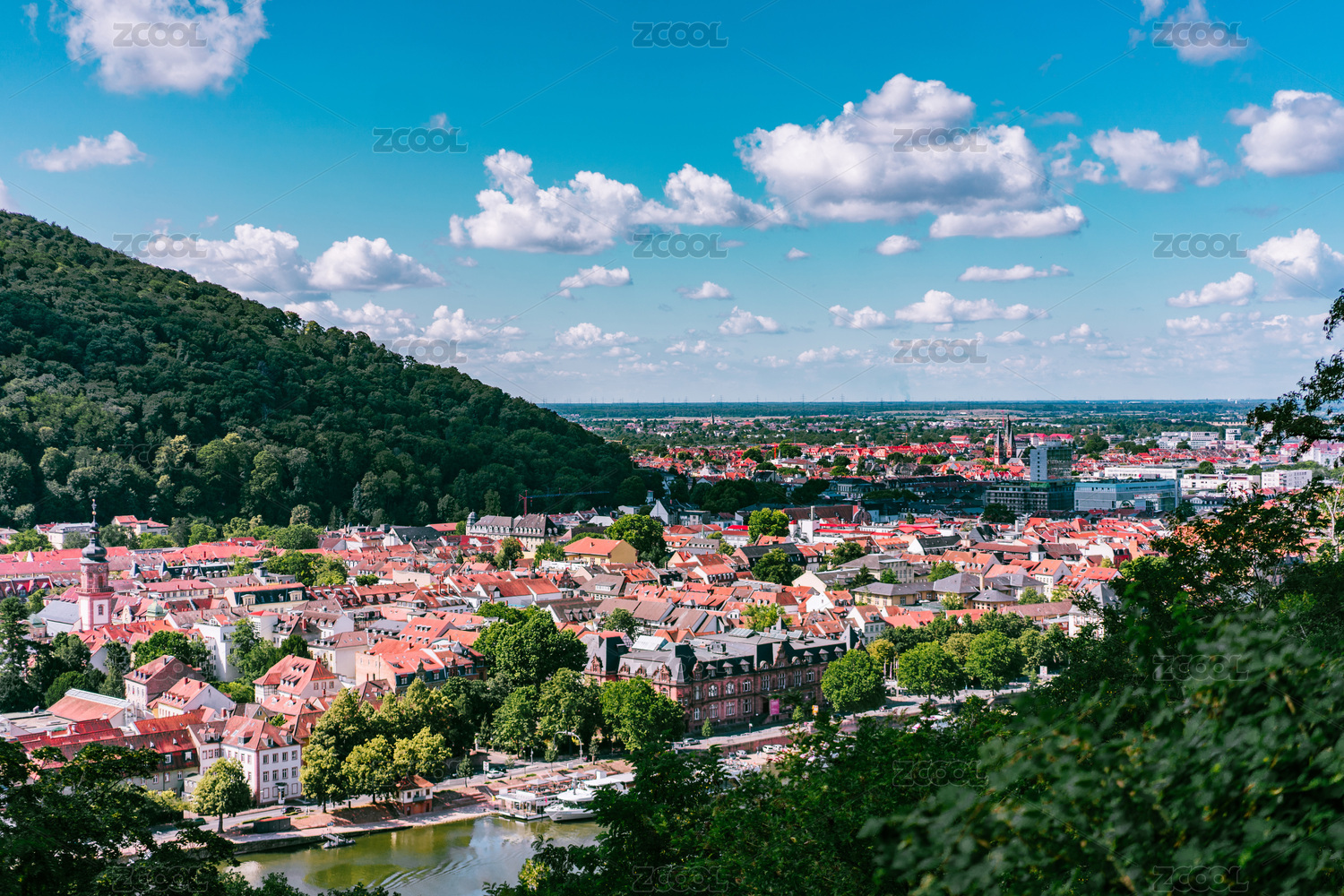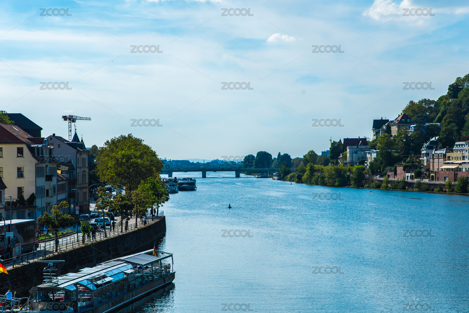 藍(lán)天白云下的德國(guó)海德堡市內(nèi)卡河風(fēng)光