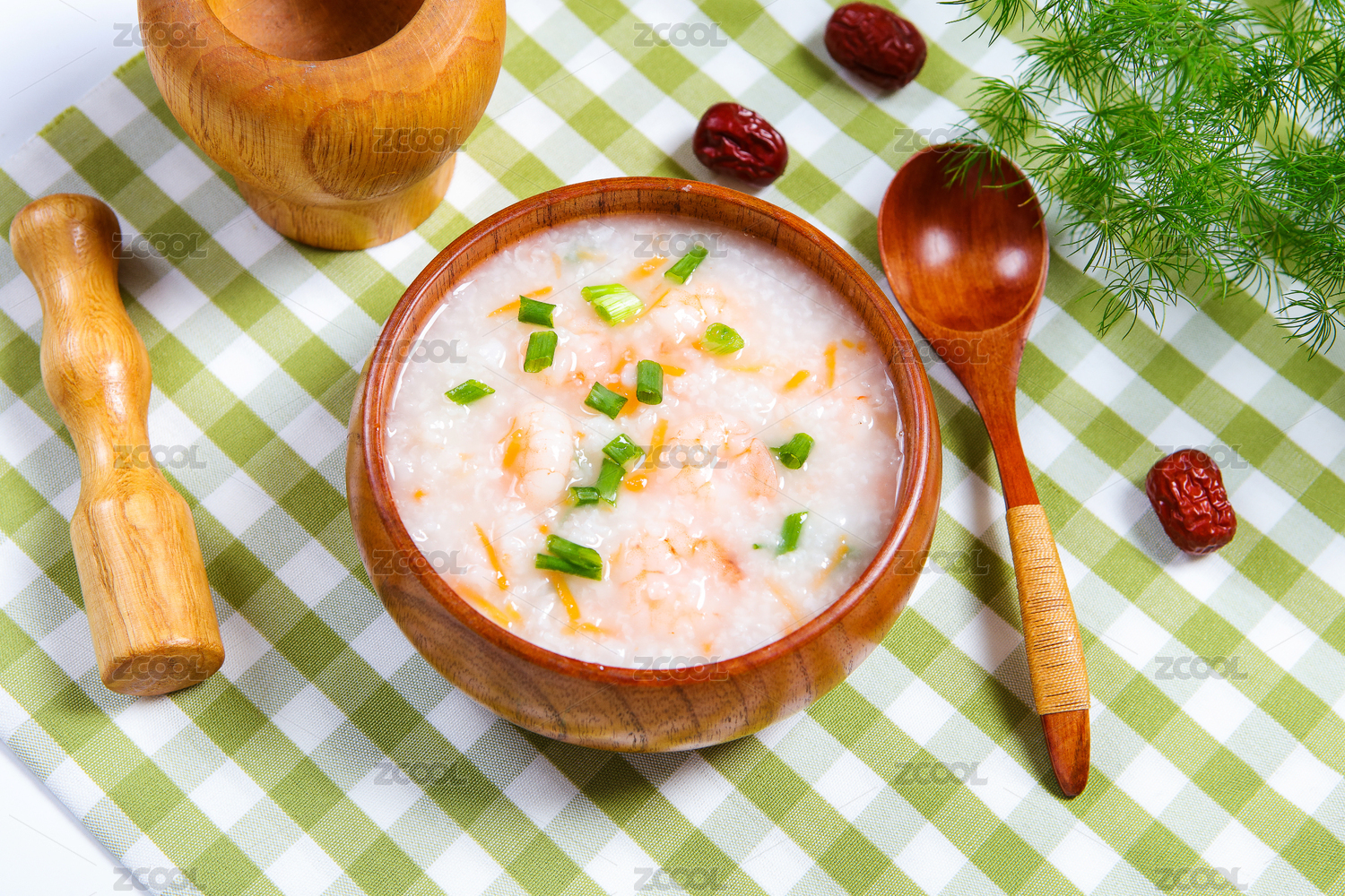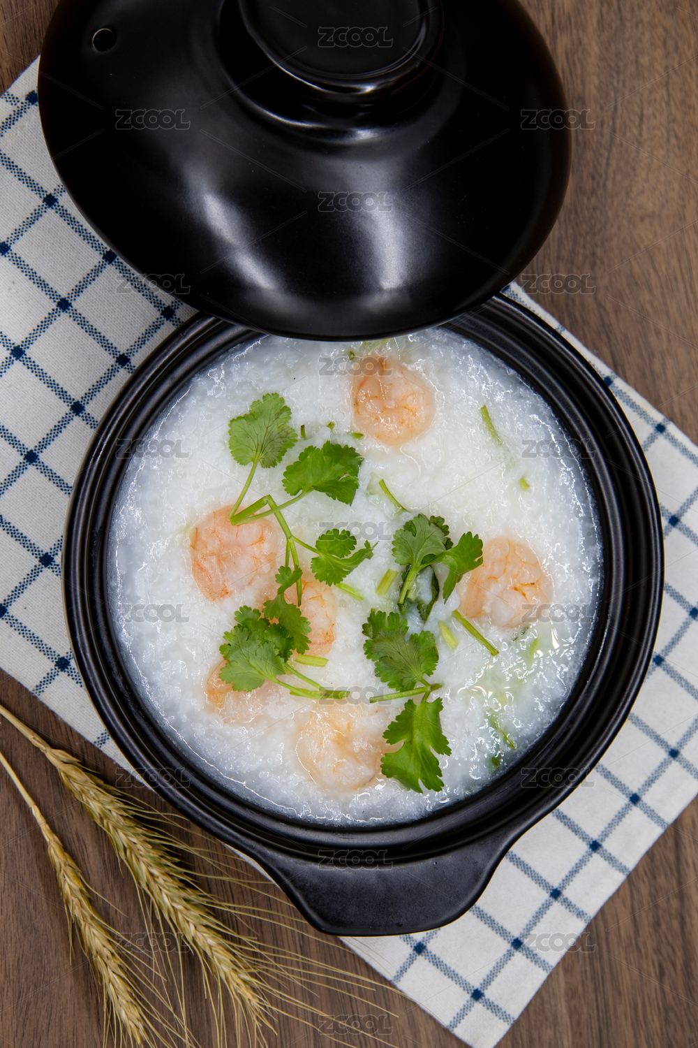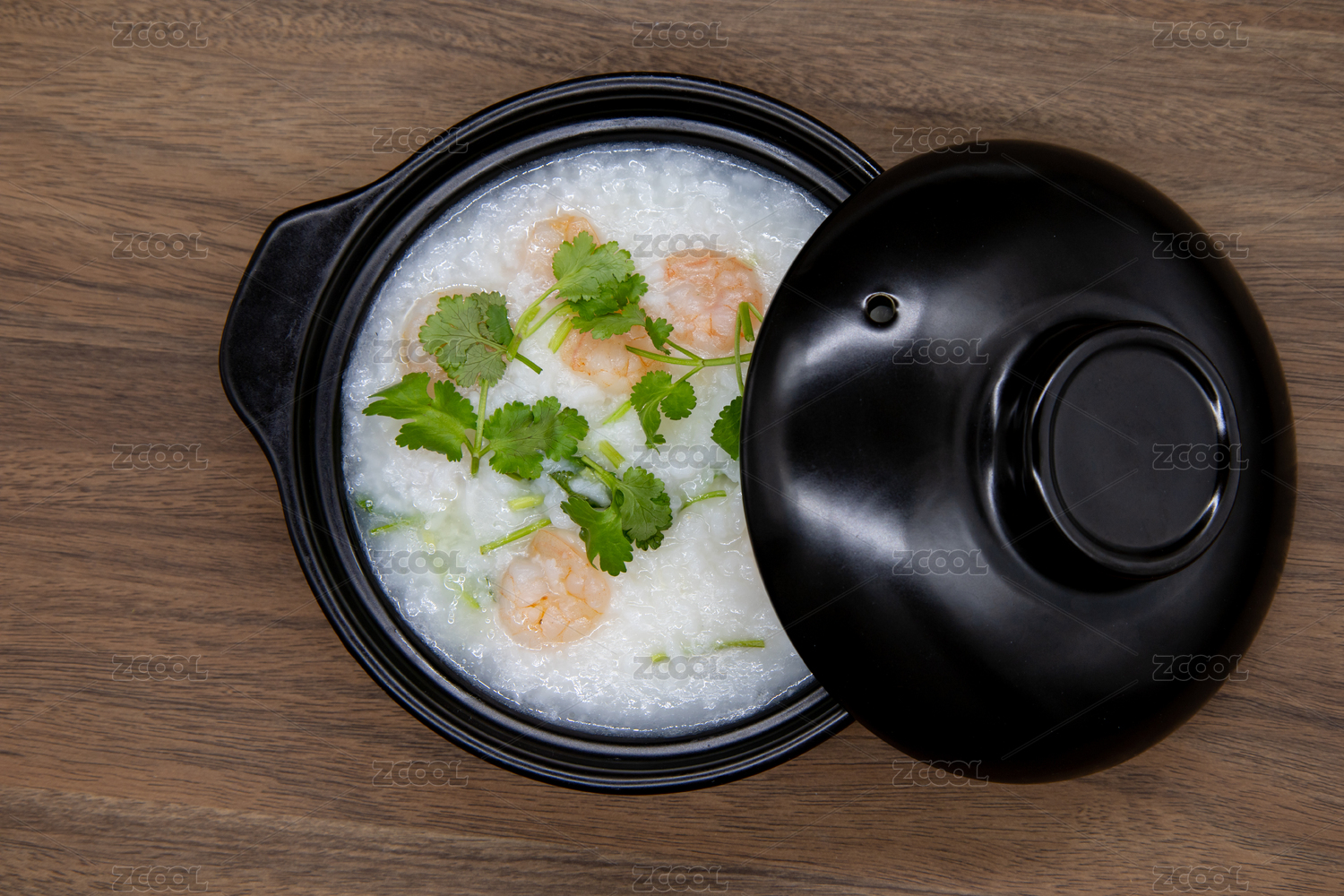 木桌背景砂鍋蝦仁粥