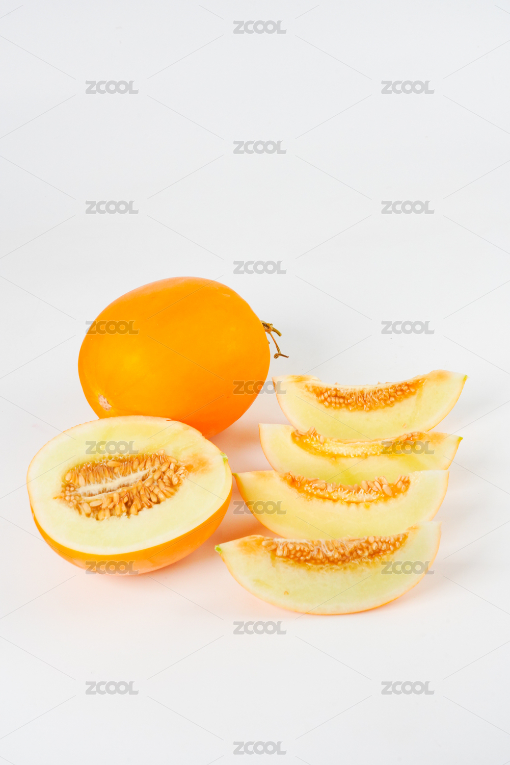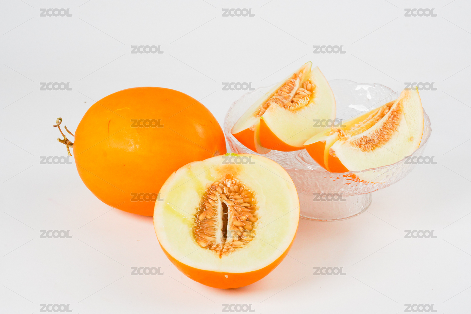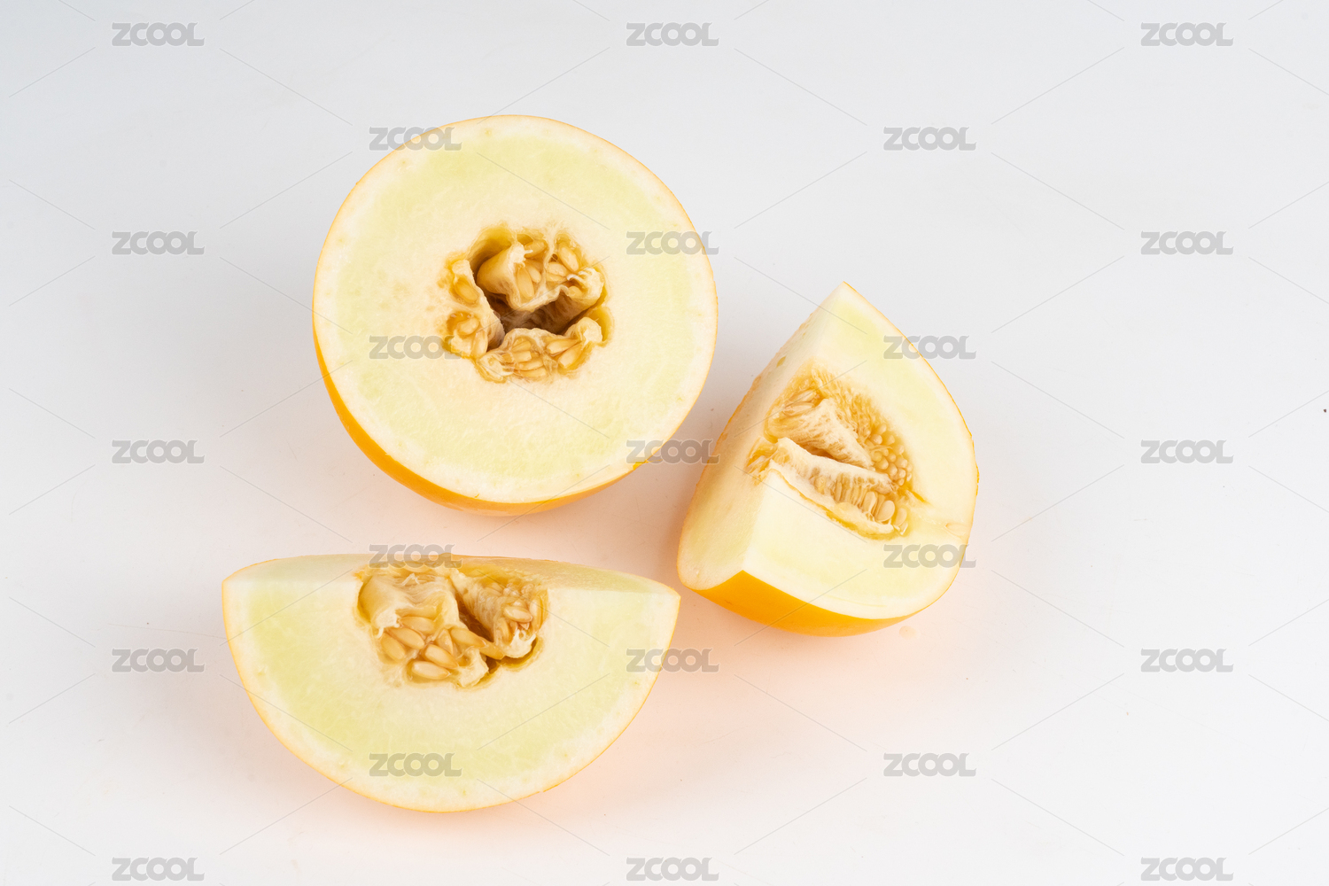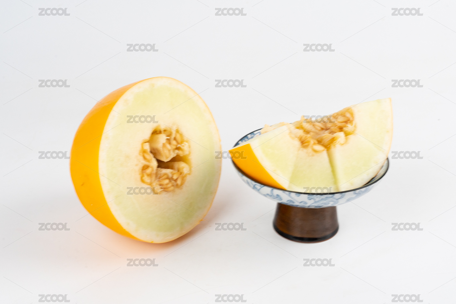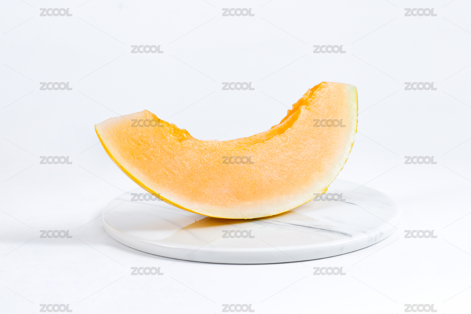 放在白色背景大理石盤(pán)子上切開(kāi)的黃金甜蜜瓜