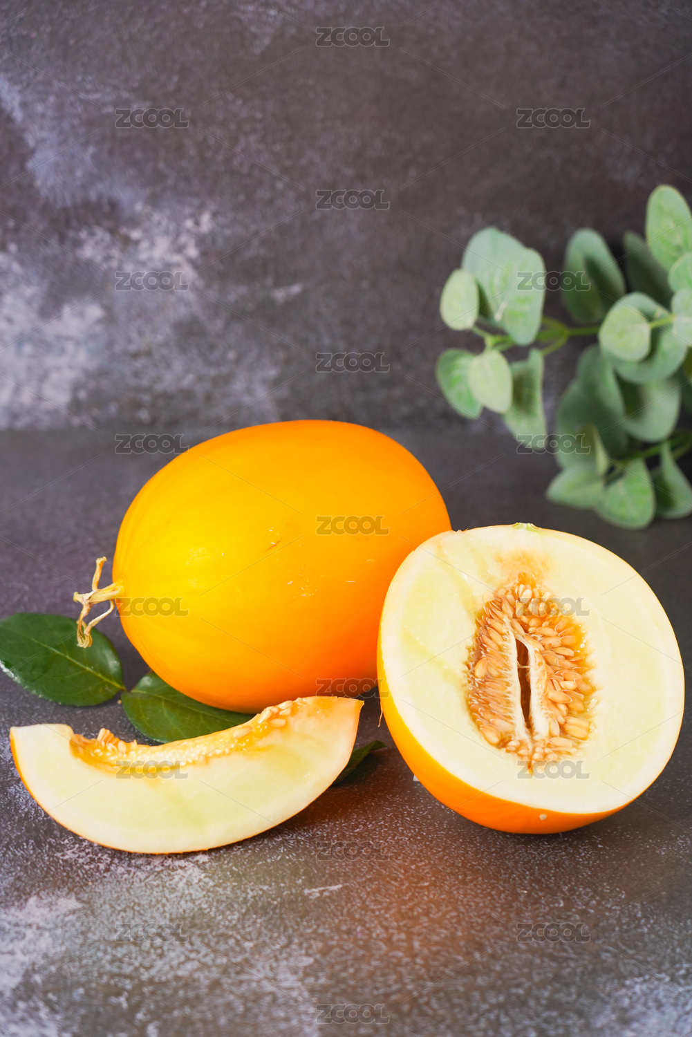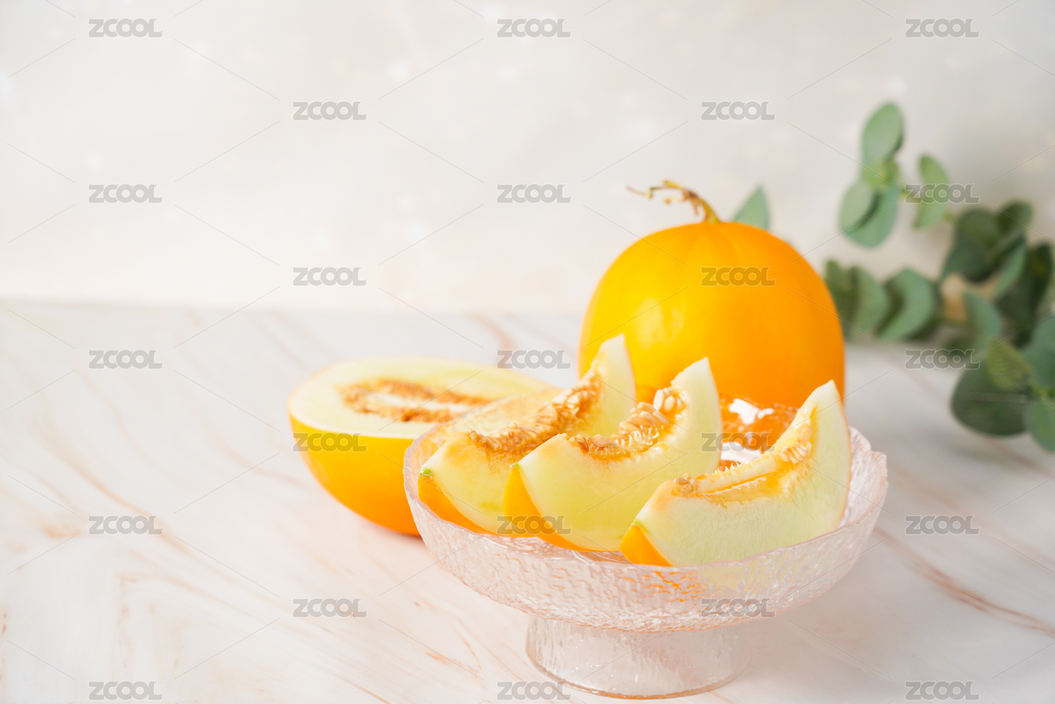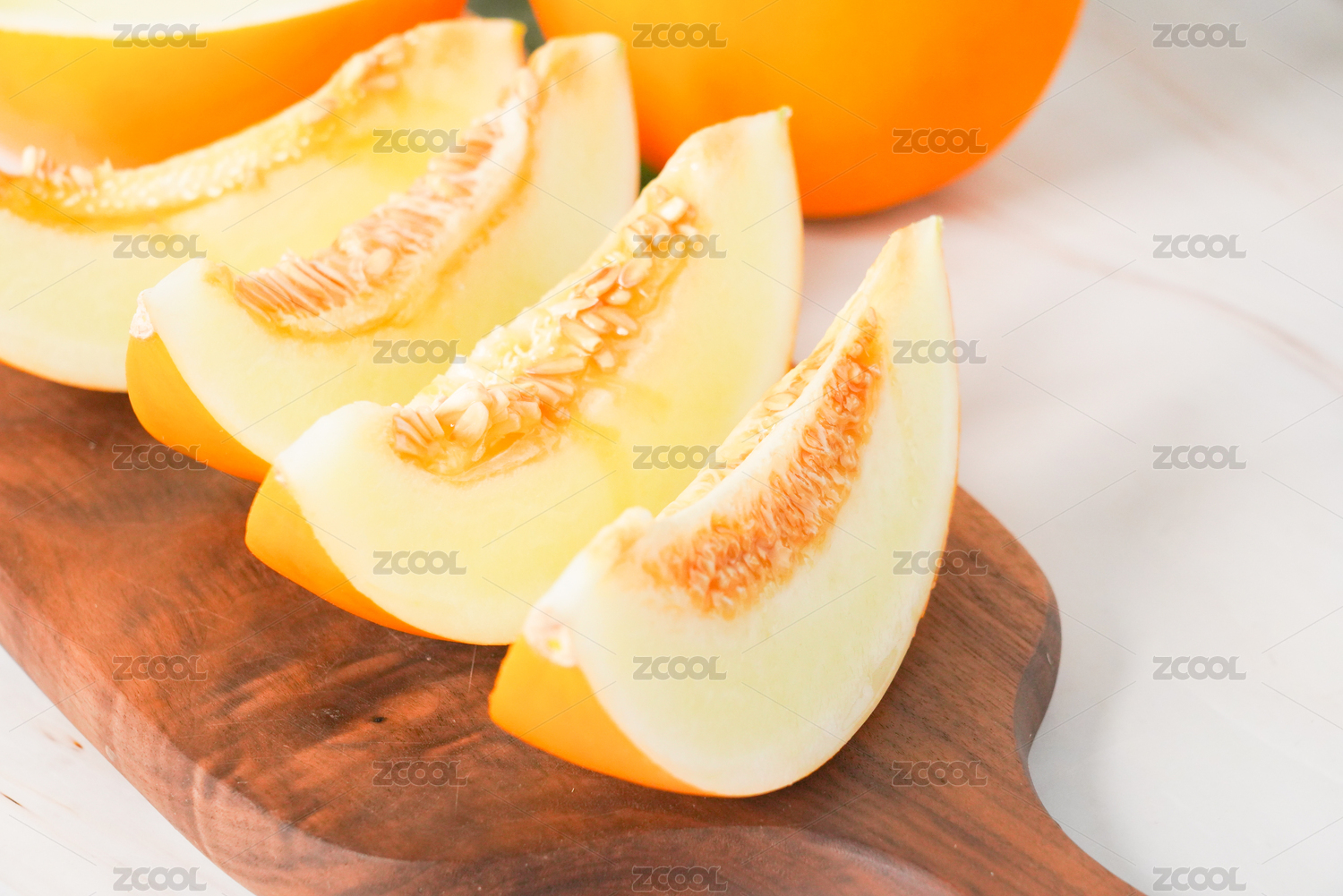 放在大理石背景托盤(pán)里切開(kāi)的黃河蜜瓜