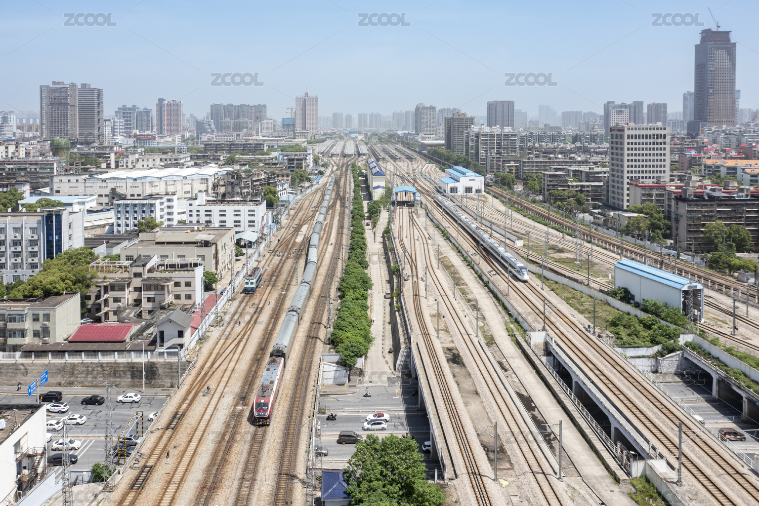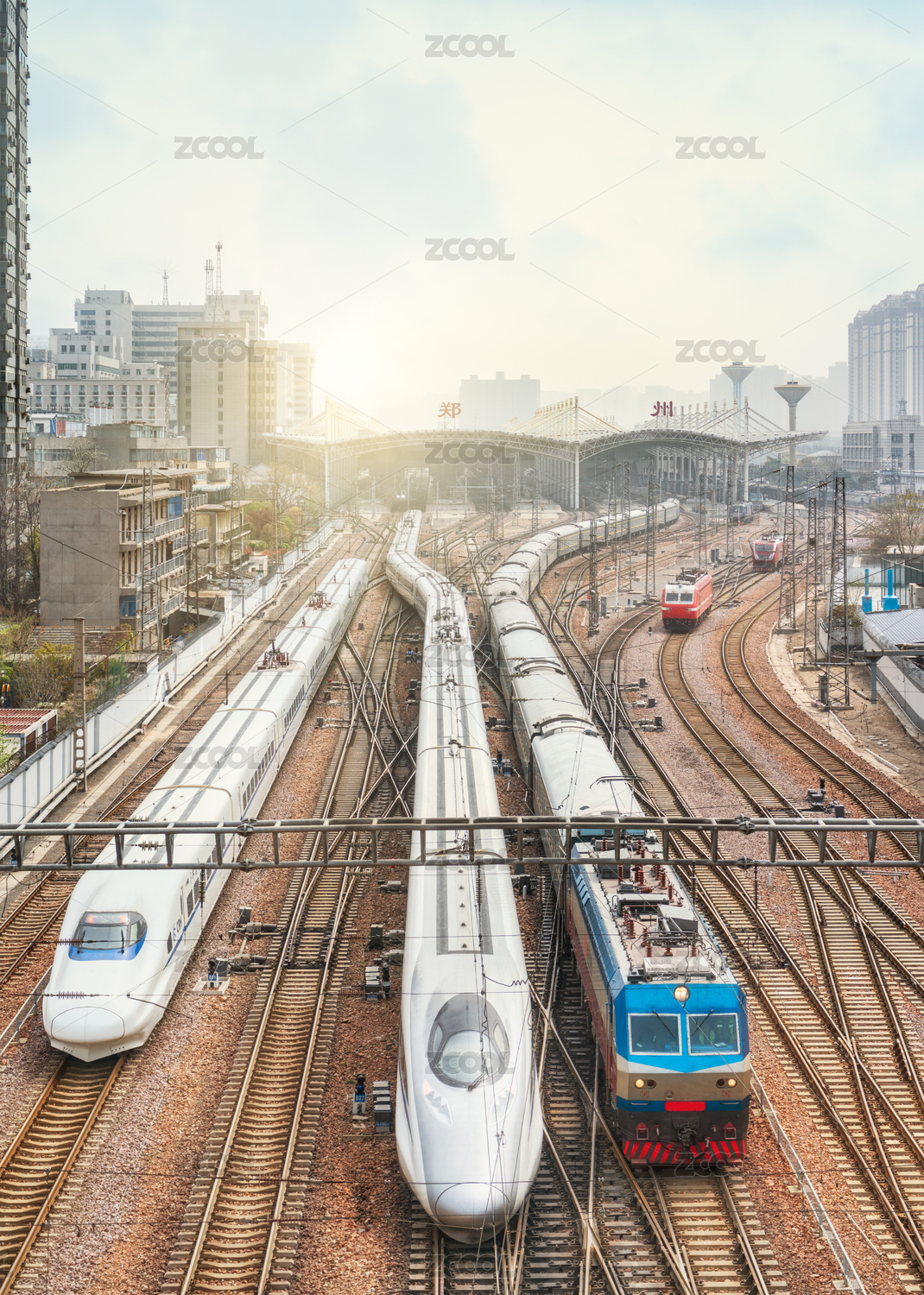 中國河南鄭州火車站進(jìn)出站的旅客列車