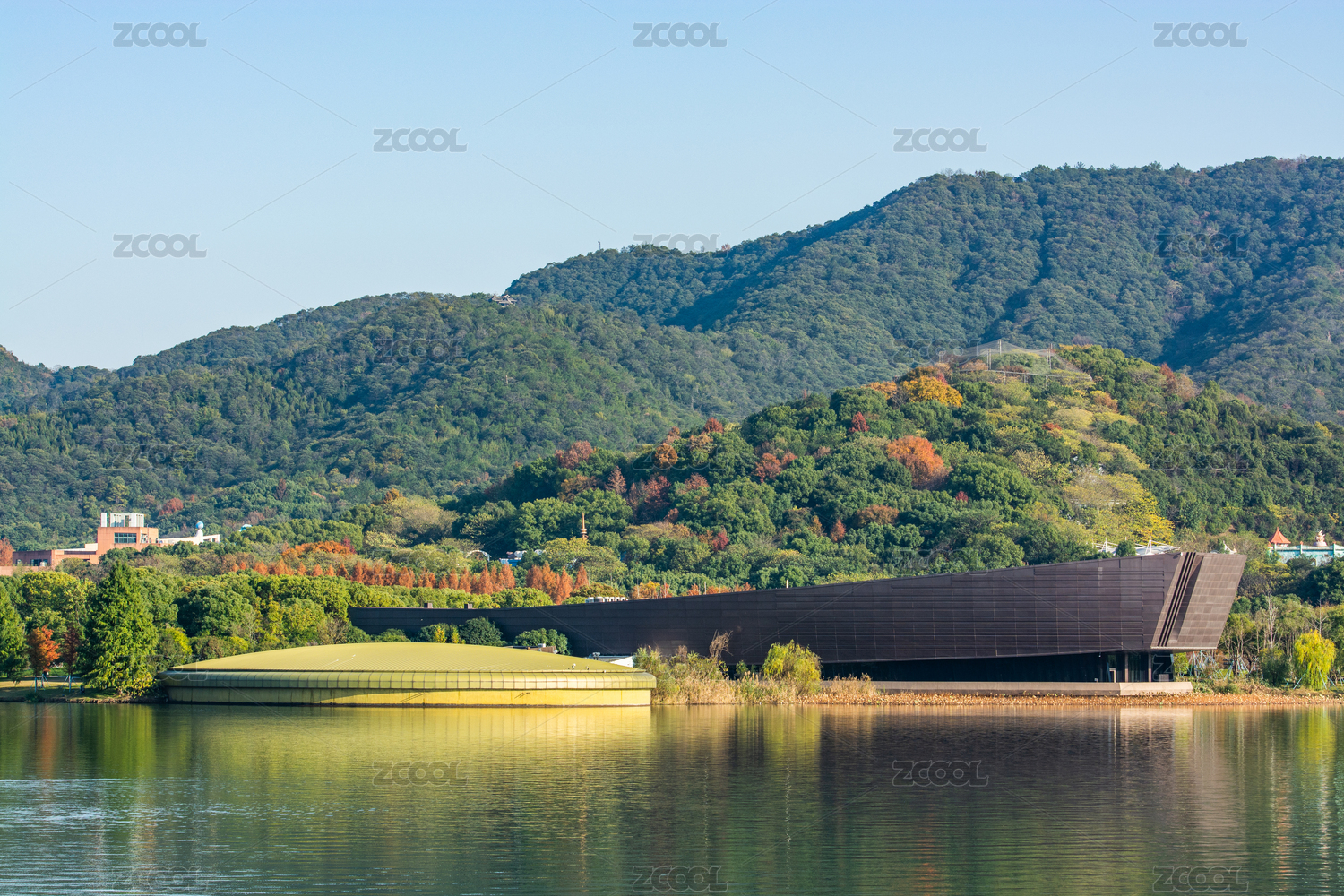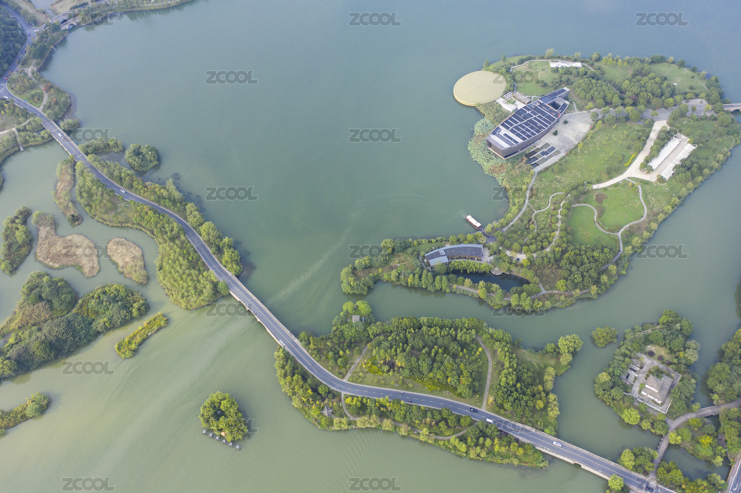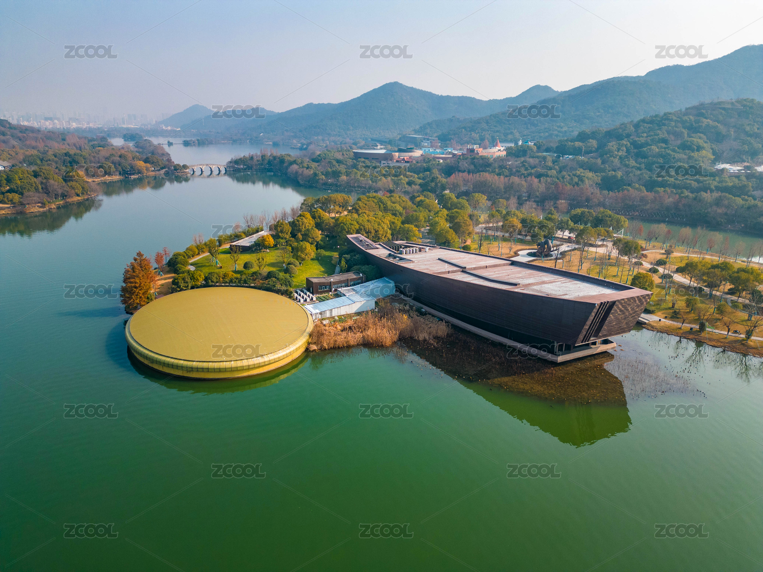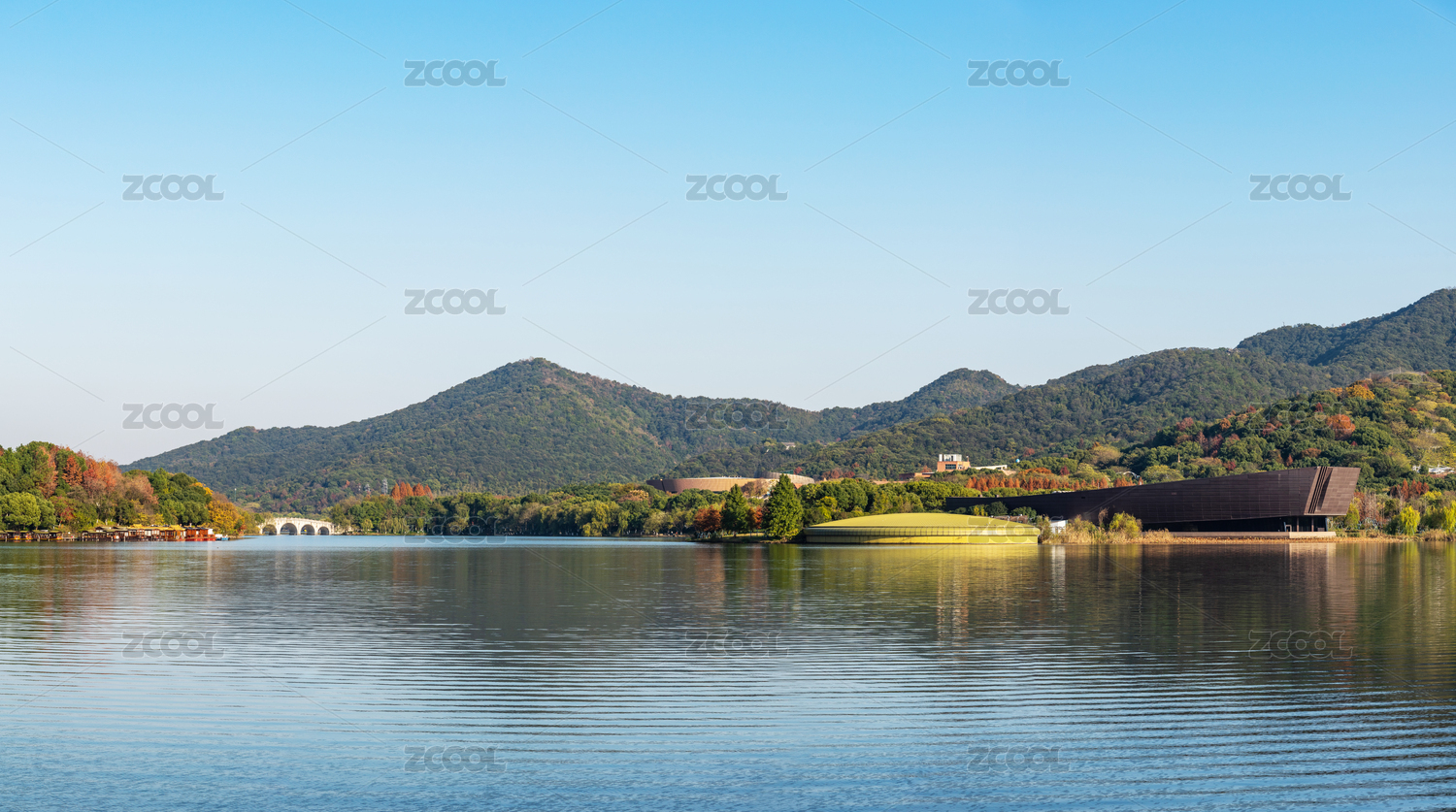 中國(guó)浙江省杭州市湘湖跨湖橋及跨湖橋遺址博物館全景