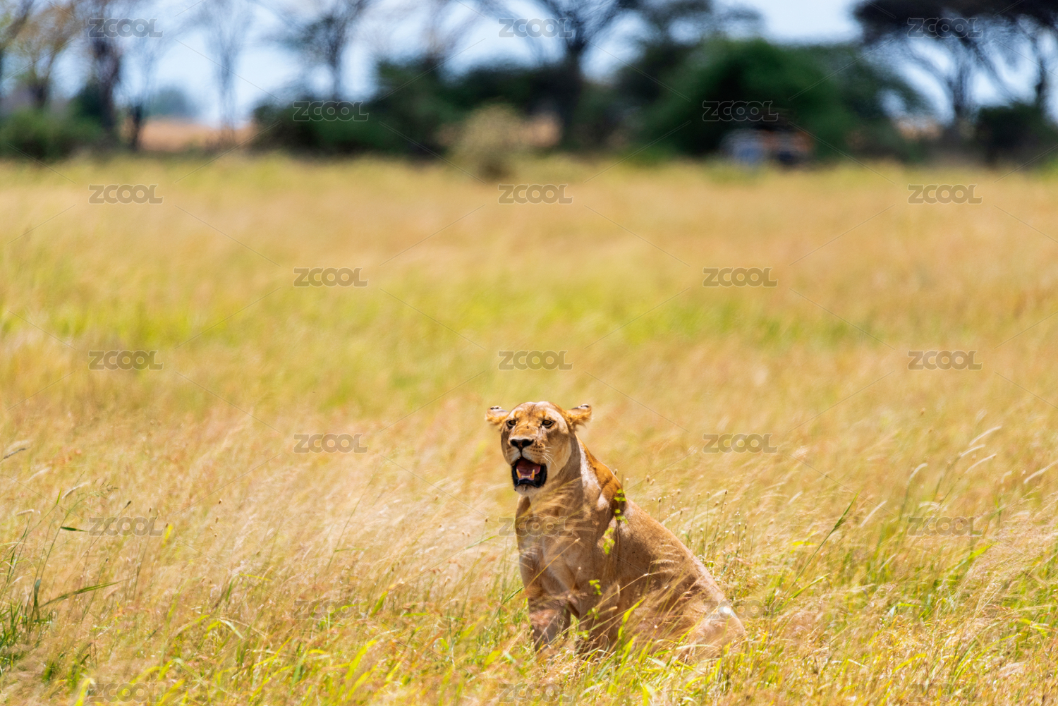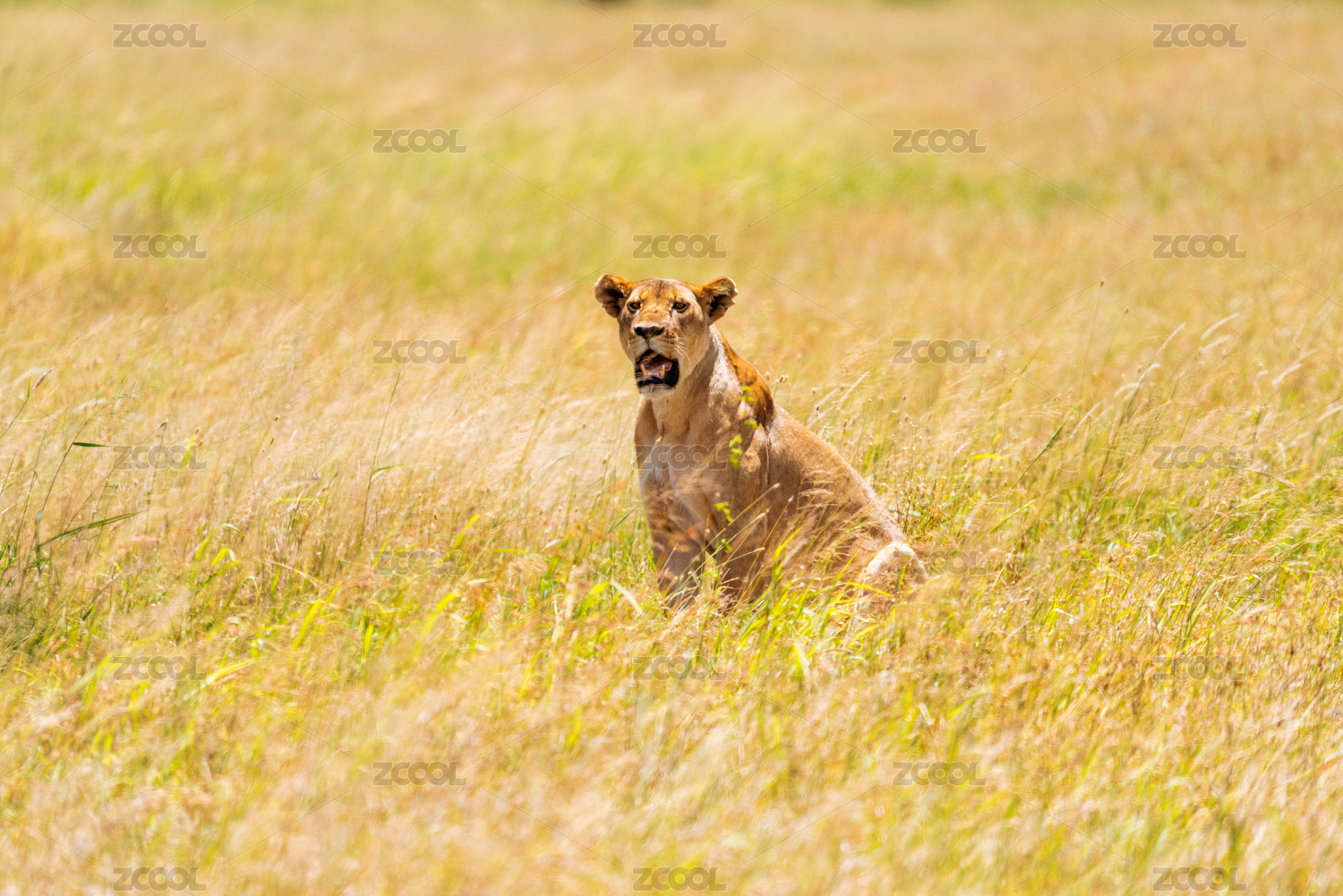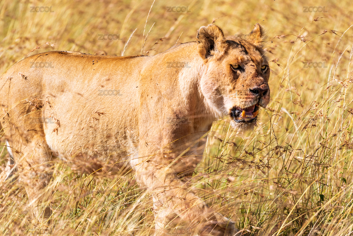 非洲肯尼亞馬賽馬拉大草原上正在尋獵的母獅