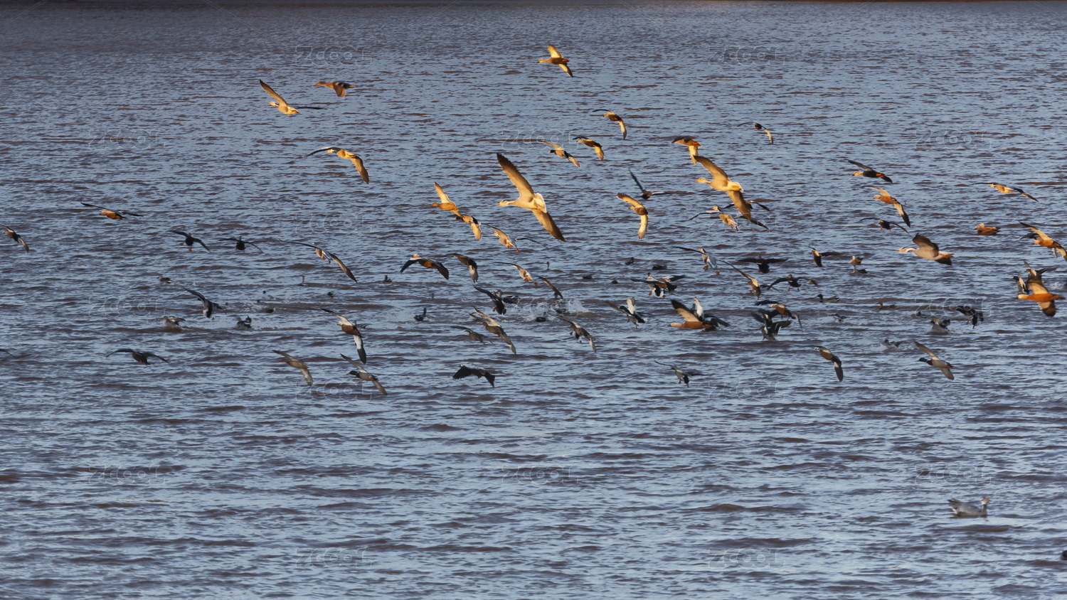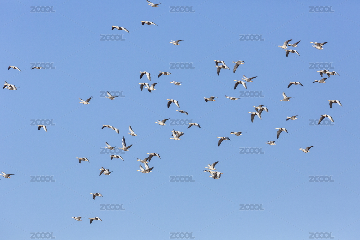 中國云南會澤念湖一群斑頭雁赤麻鴨飛翔