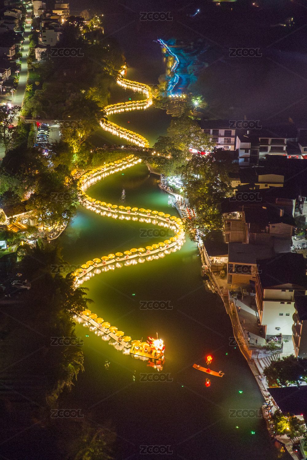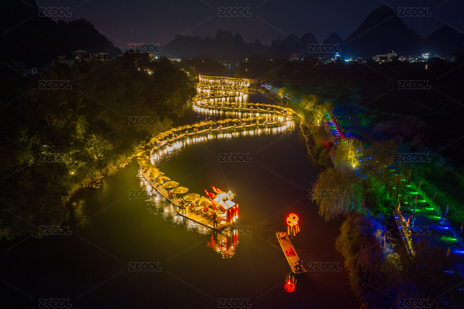 中國(guó)廣西桂林陽(yáng)朔遇龍河景區(qū)竹筏金龍夜游