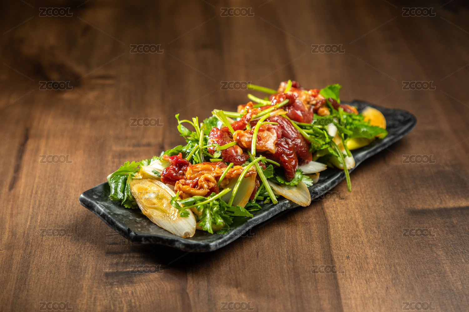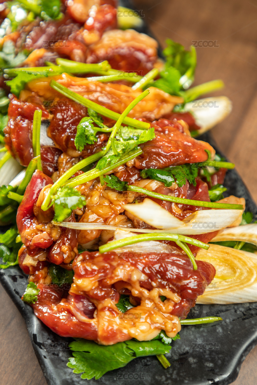 棕色木紋桌上放著一盤(pán)秘制手切鮮羊肉