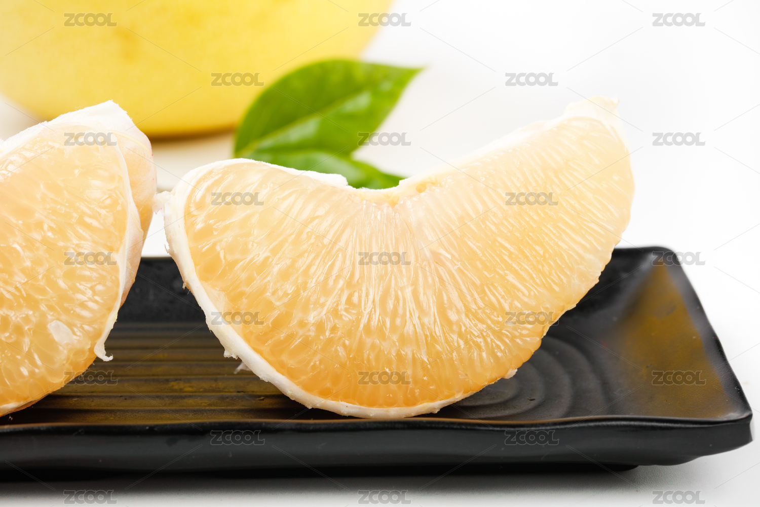 白格子底上俯拍黑盤(pán)子裝著的貢柑橘和果肉切面