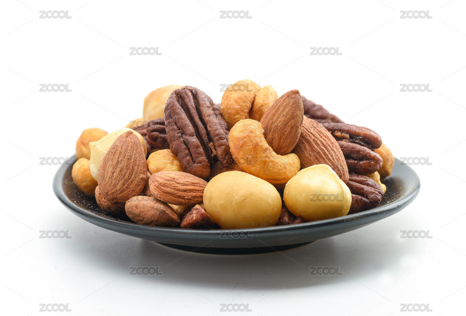 白色背景上黑盤(pán)子里的堅(jiān)果果仁拼盤(pán)