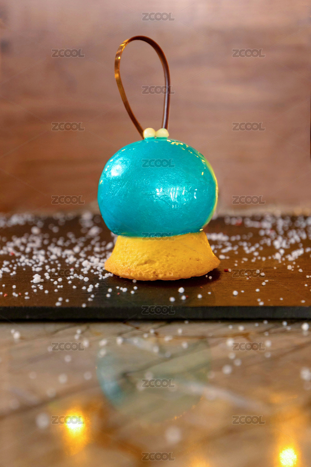 黑盤(pán)子上放著一個(gè)藍(lán)色鈴鐺形狀的甜品