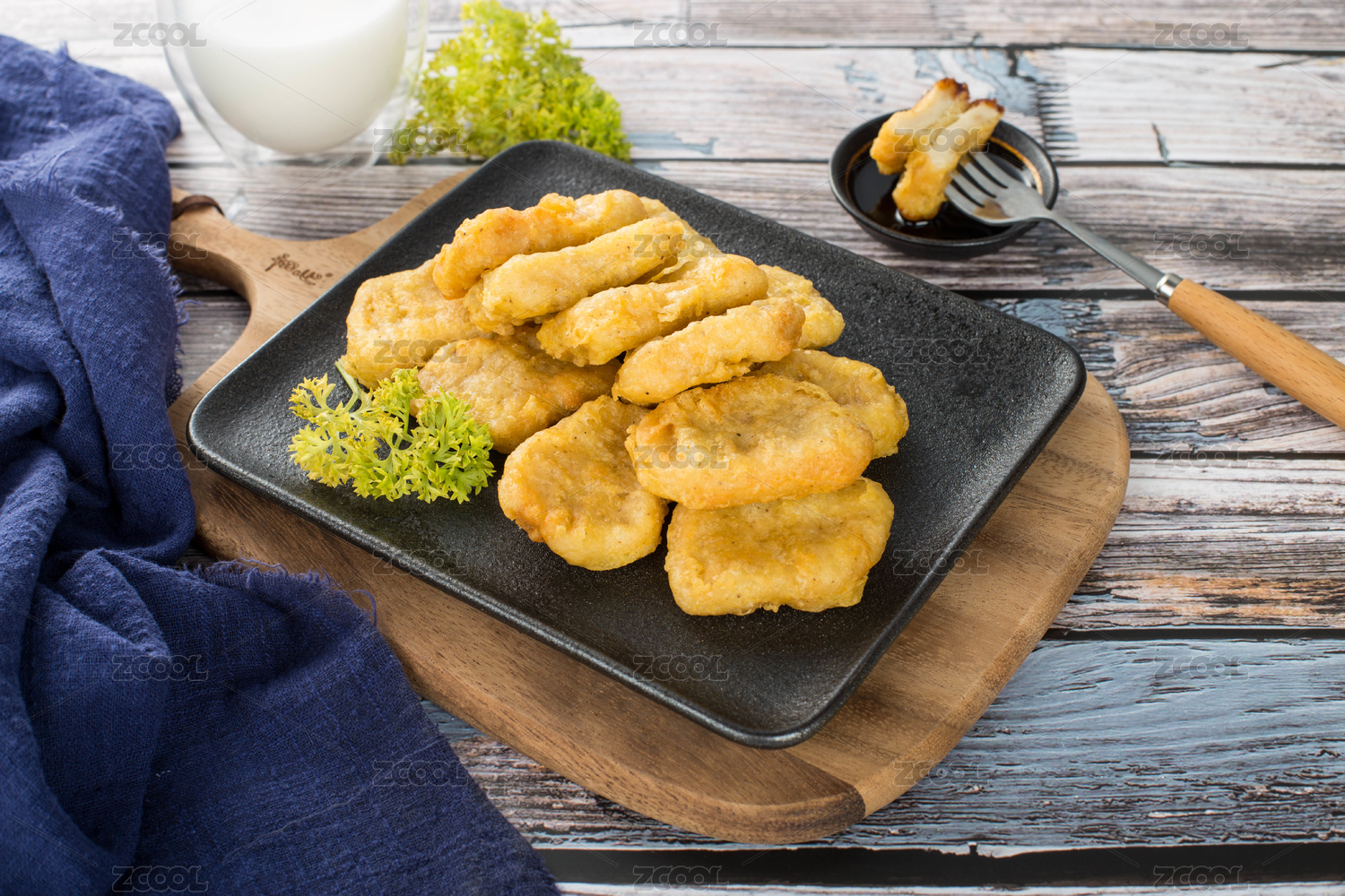 長(zhǎng)方形黑盤(pán)子里油炸雞塊放在米板背景上