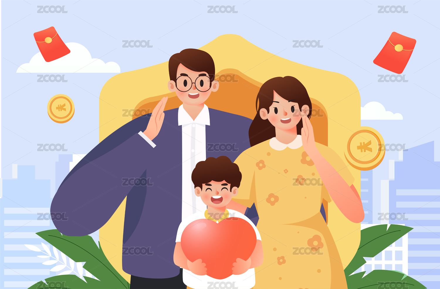 一家三口手捧保護(hù)盾插畫