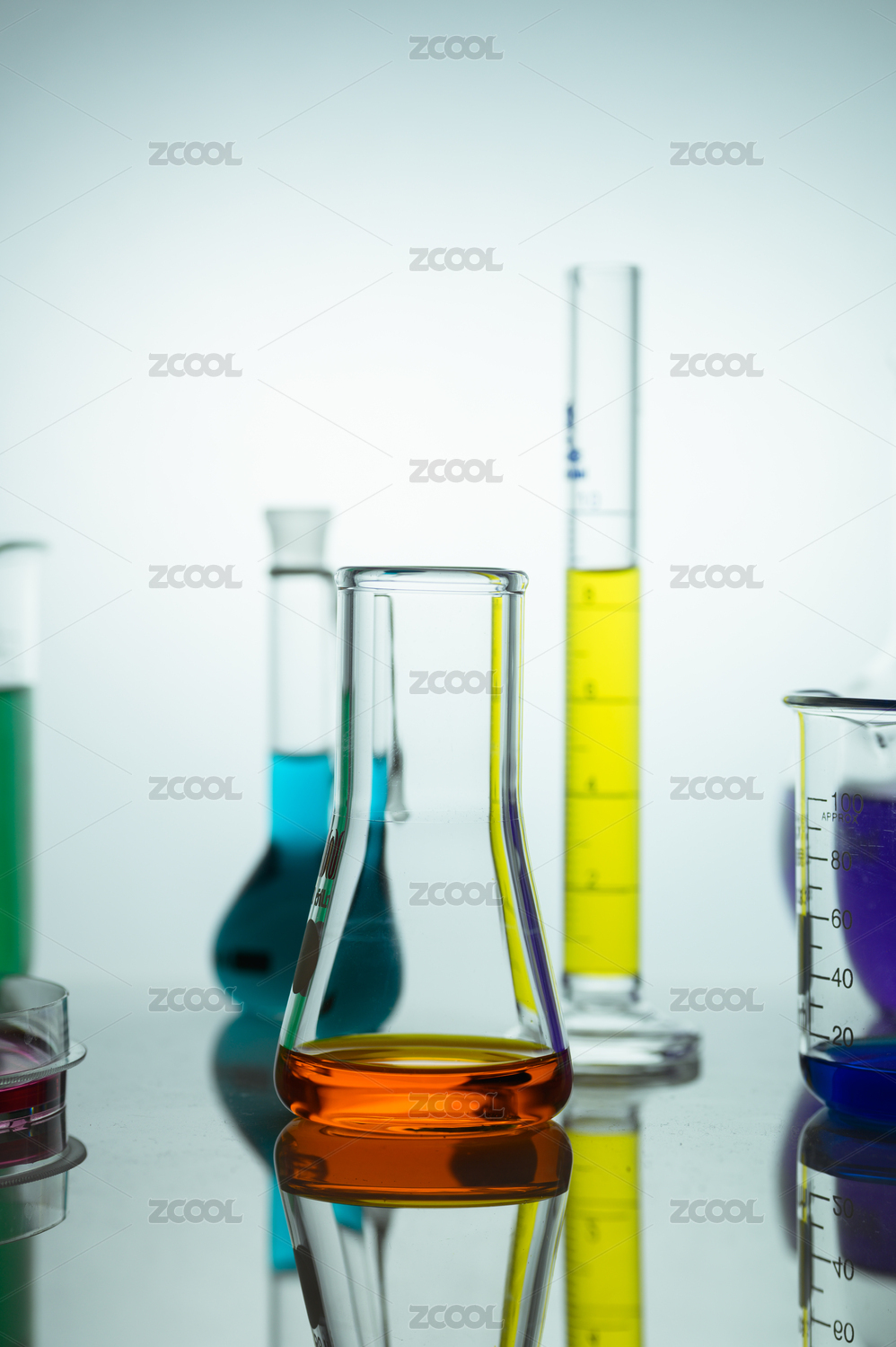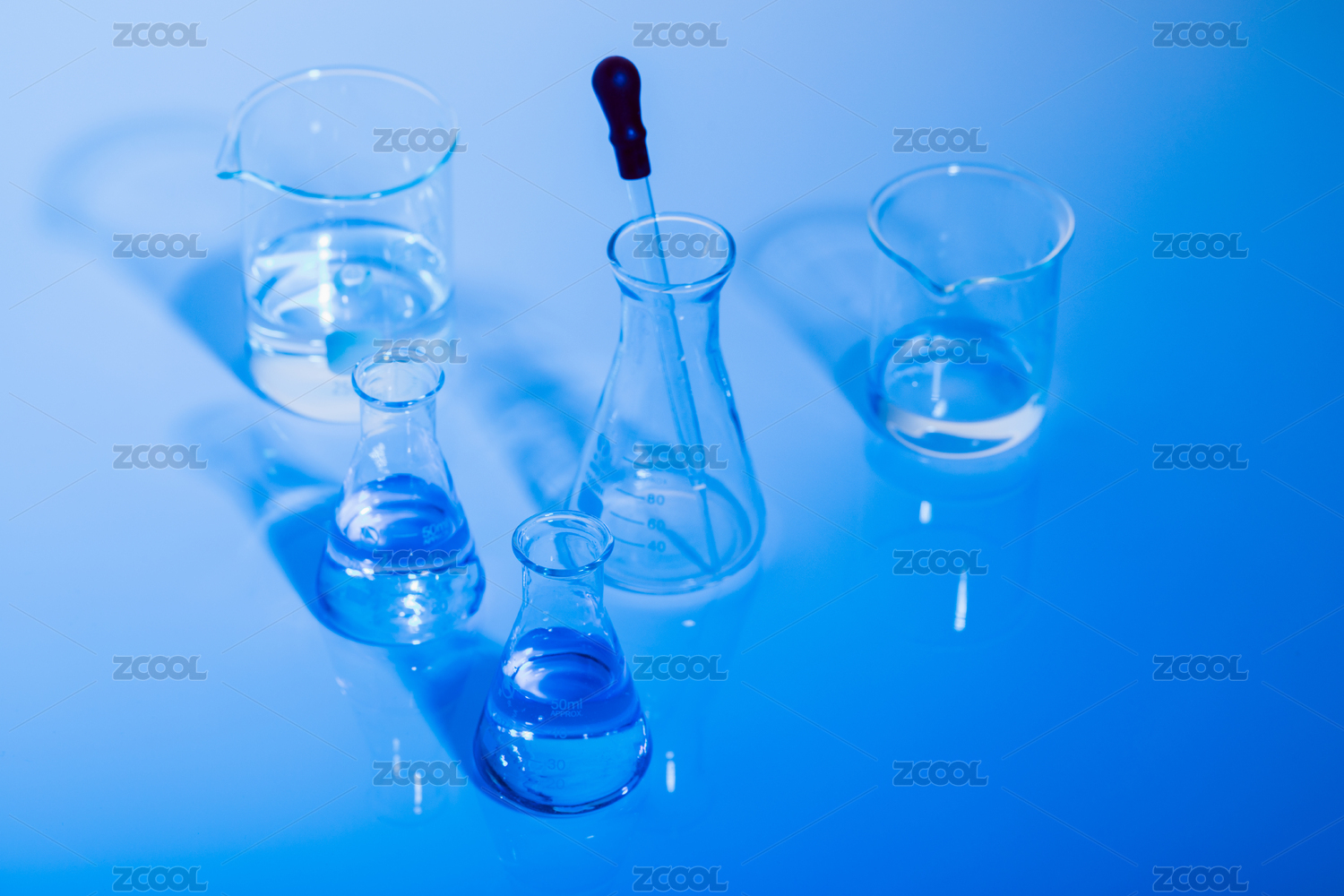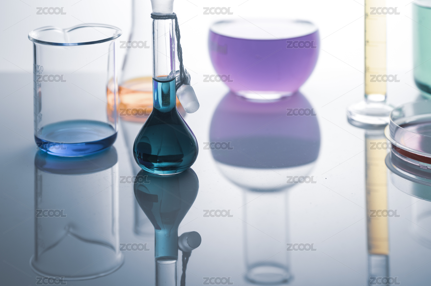 藍(lán)色燈光打在化學(xué)試驗(yàn)的各類玻璃儀器上