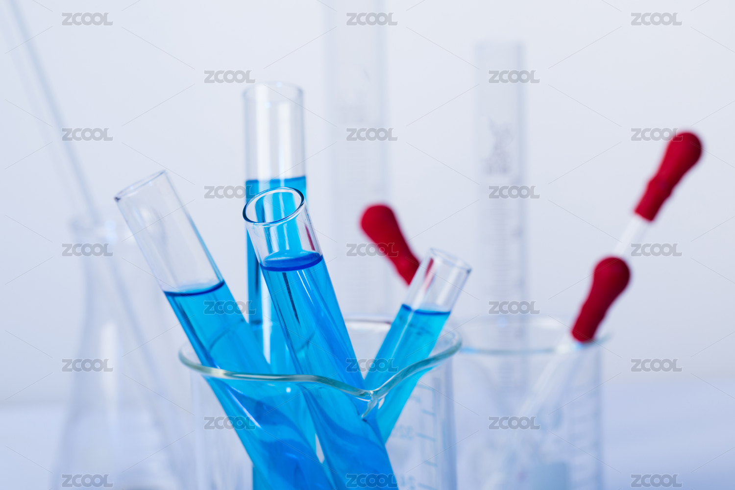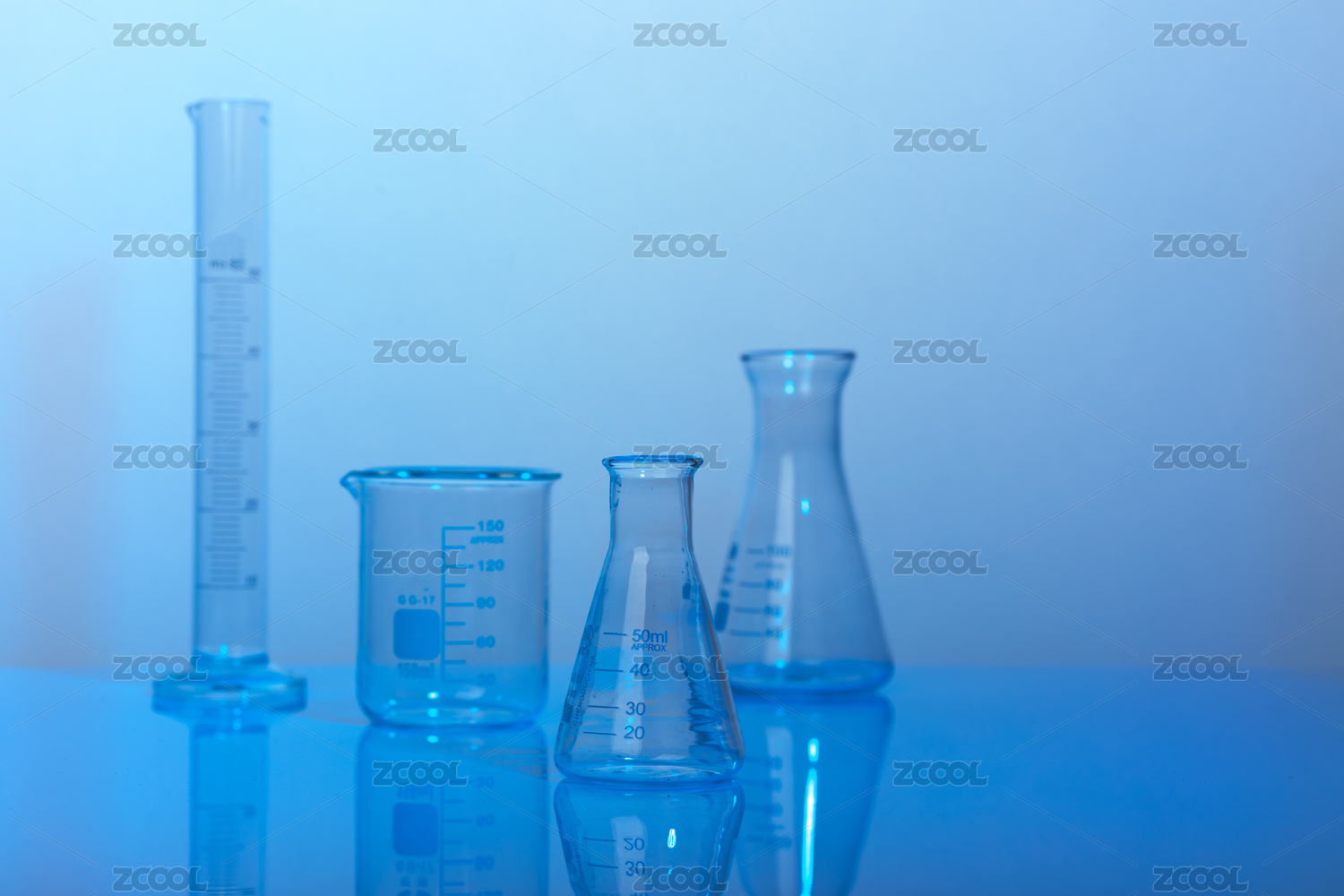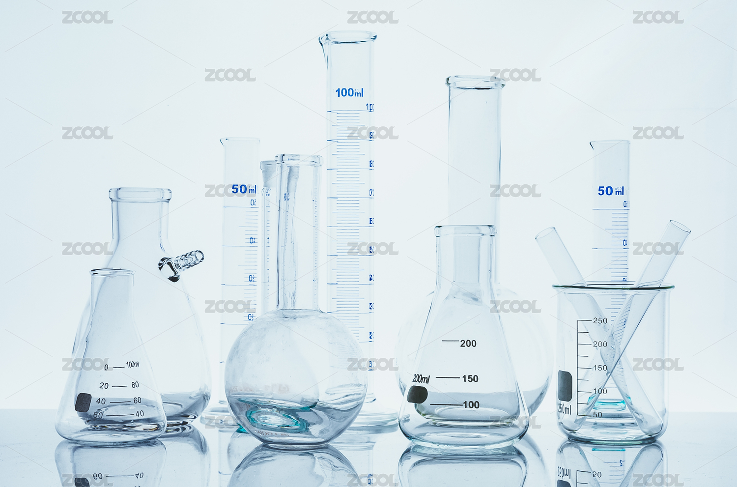 淺藍(lán)色背景前擺放醫(yī)療化學(xué)實(shí)驗(yàn)玻璃儀器