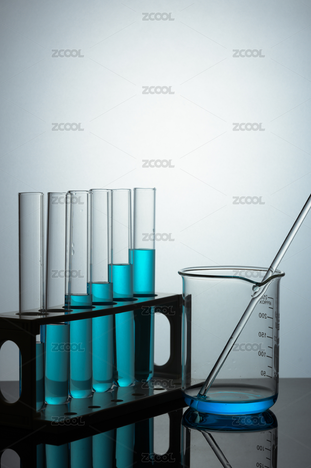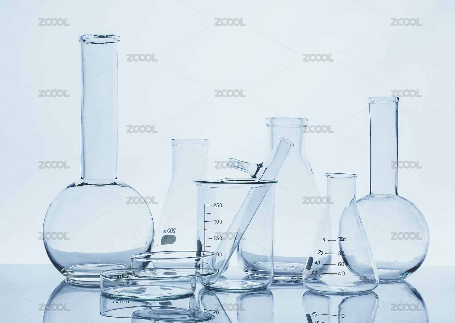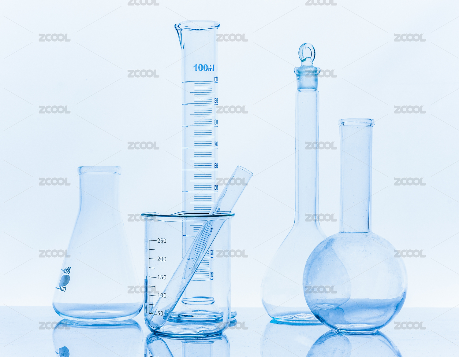 淺藍(lán)色背景前擺放醫(yī)療化學(xué)實(shí)驗(yàn)玻璃儀器