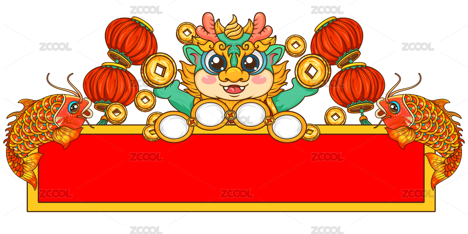 龍年錦鯉紅燈籠金幣橫幅傳統(tǒng)邊框