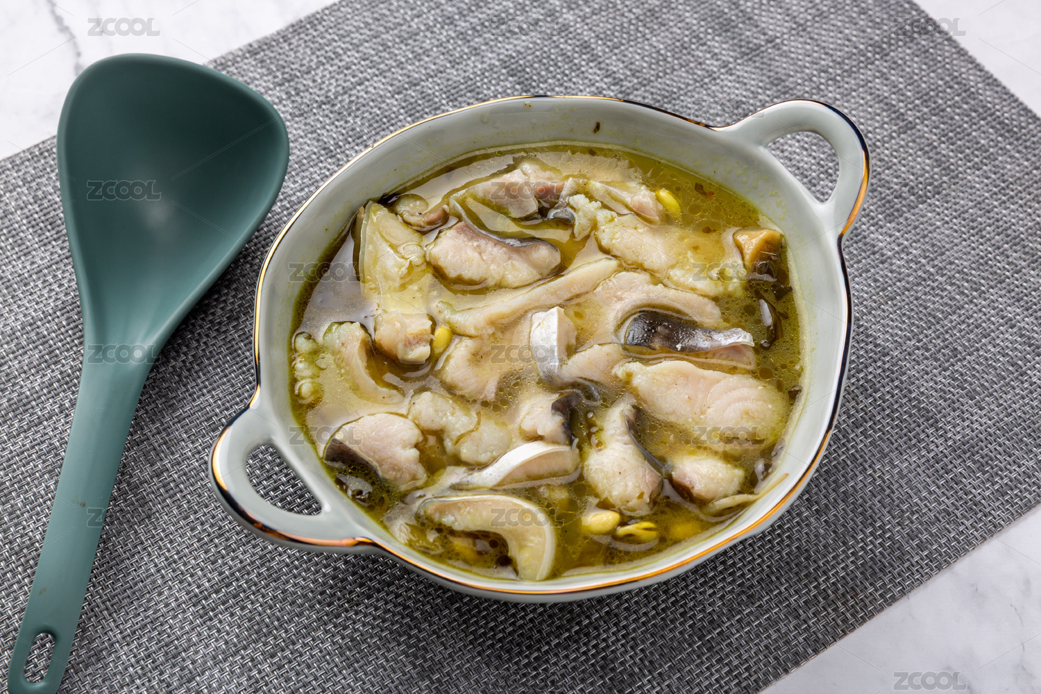 勺子舀的酸菜魚片