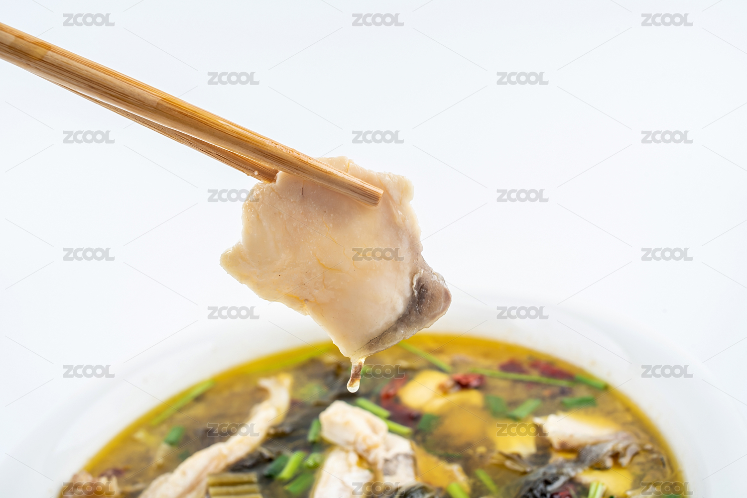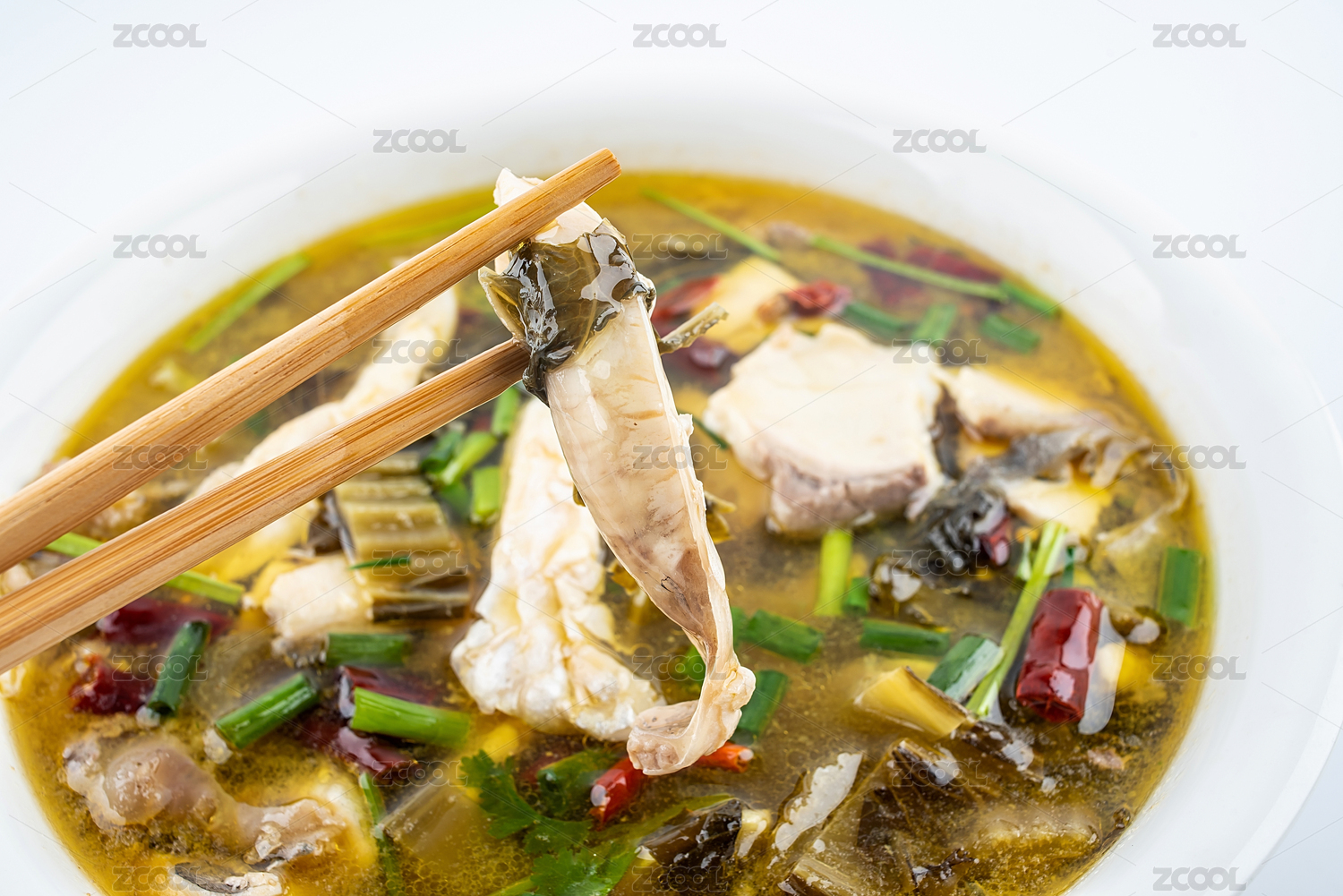 用筷子夾起酸菜魚片
