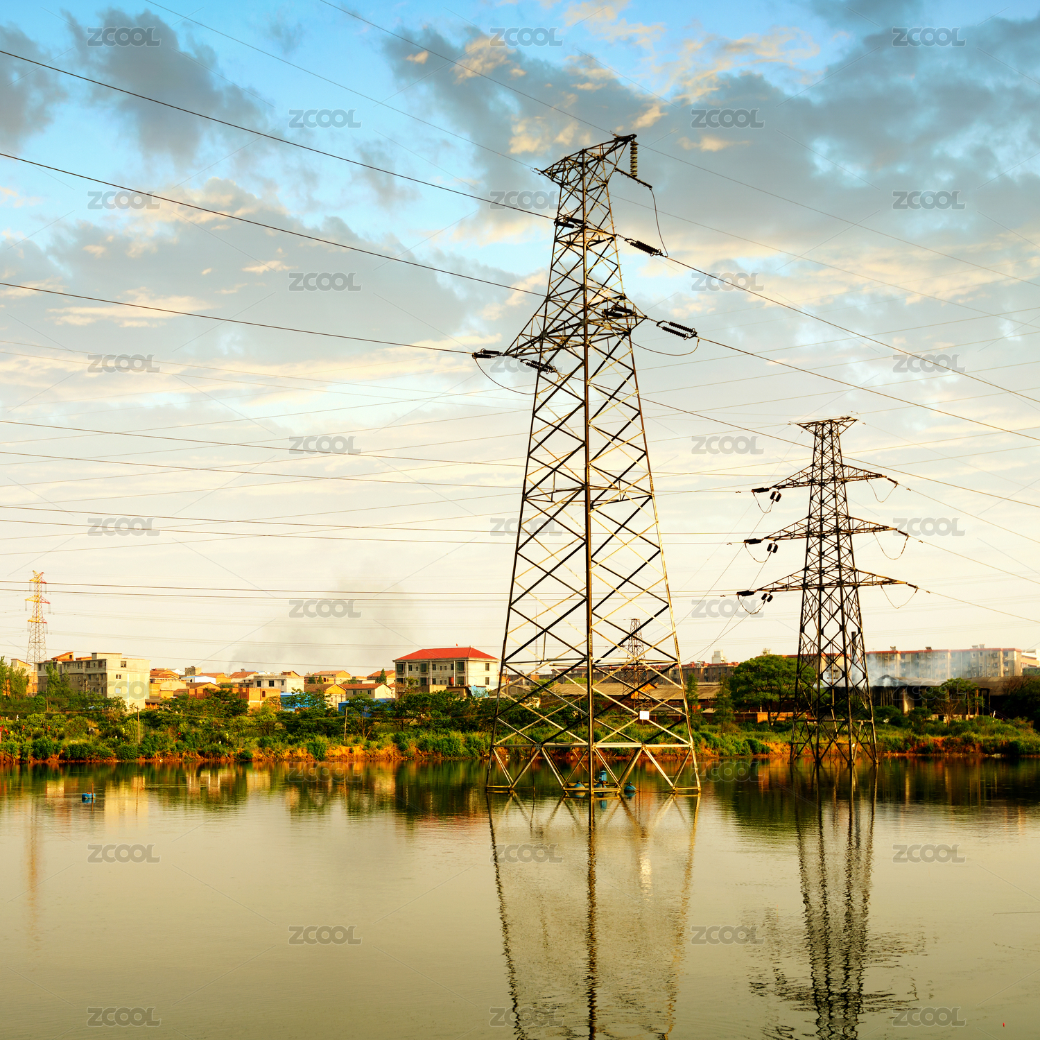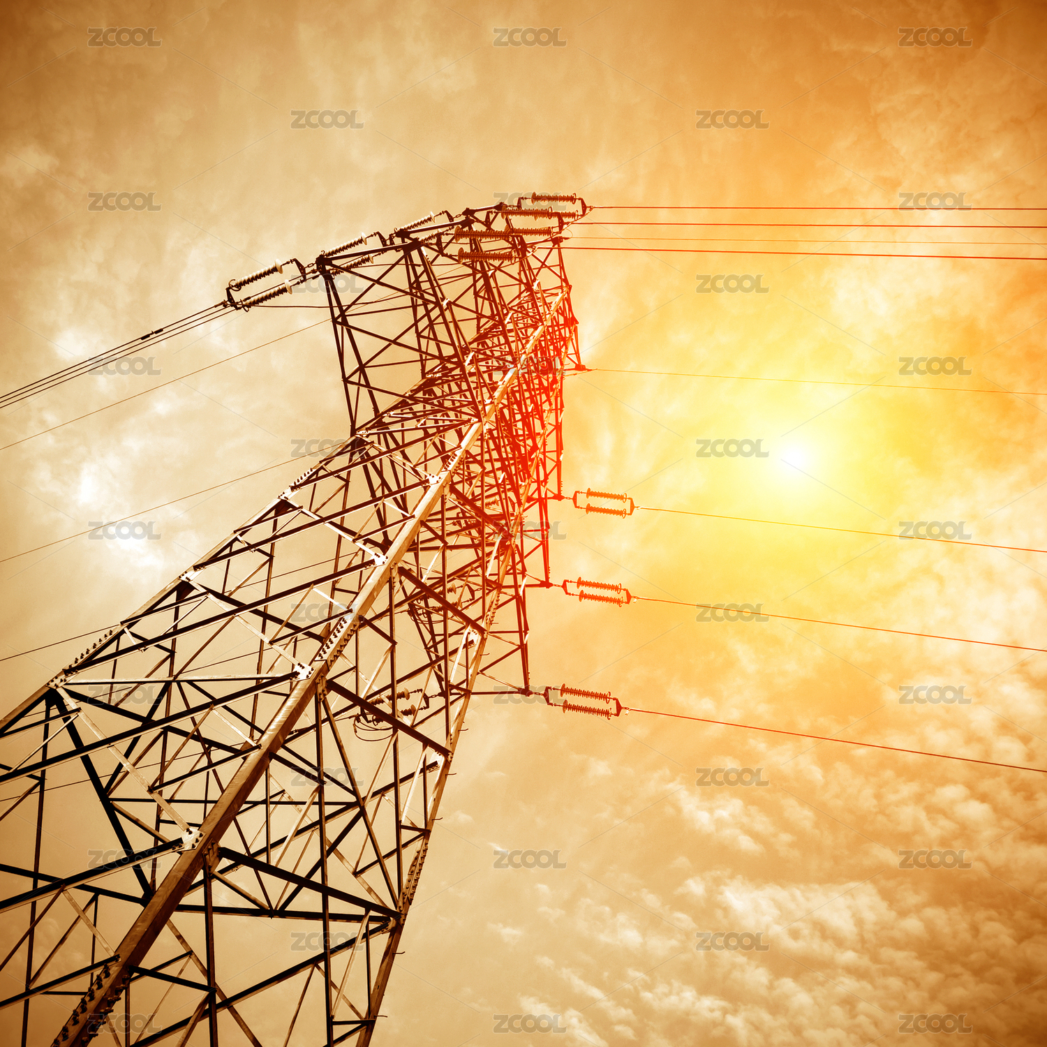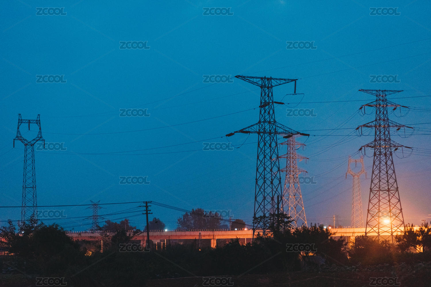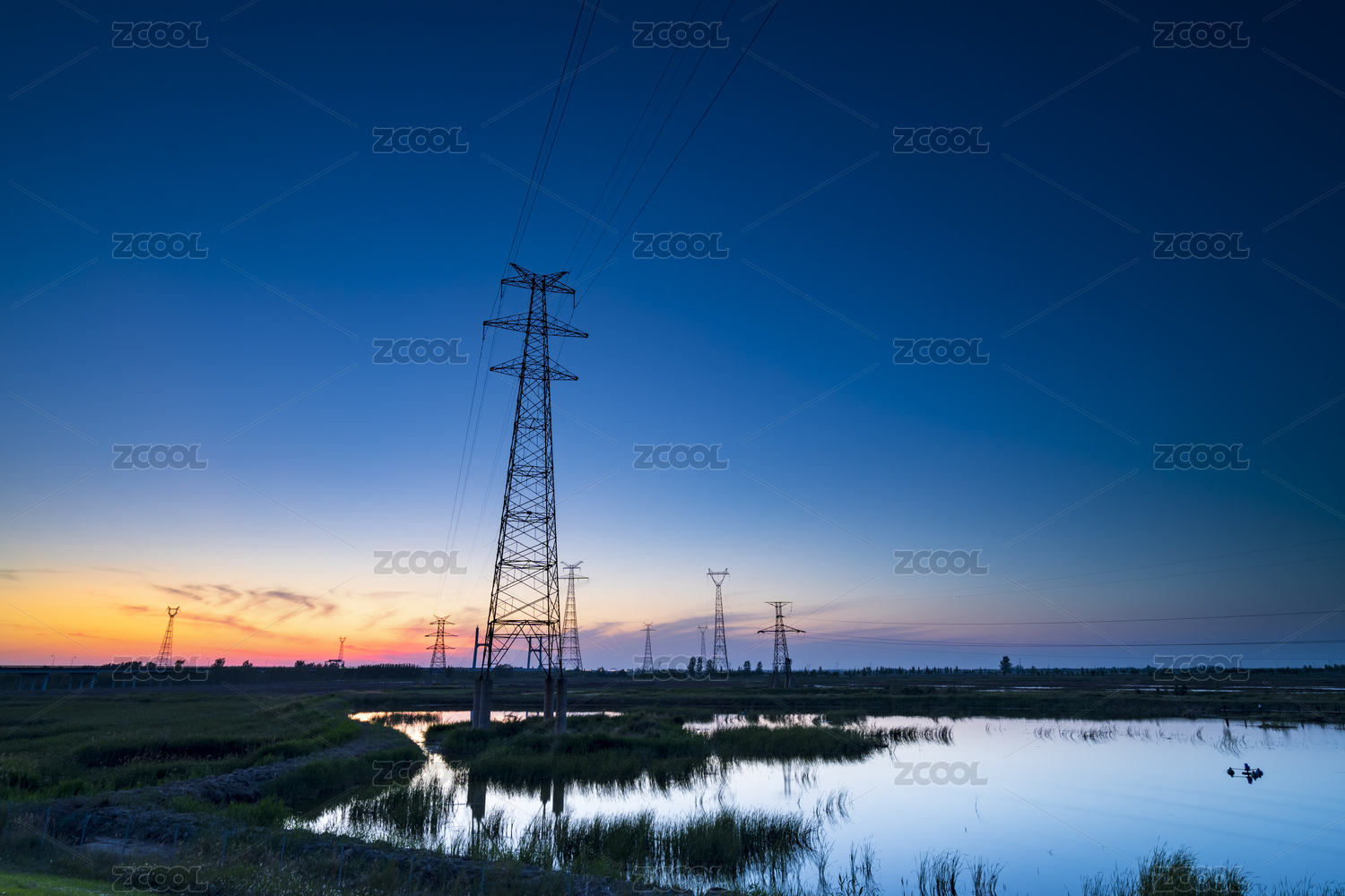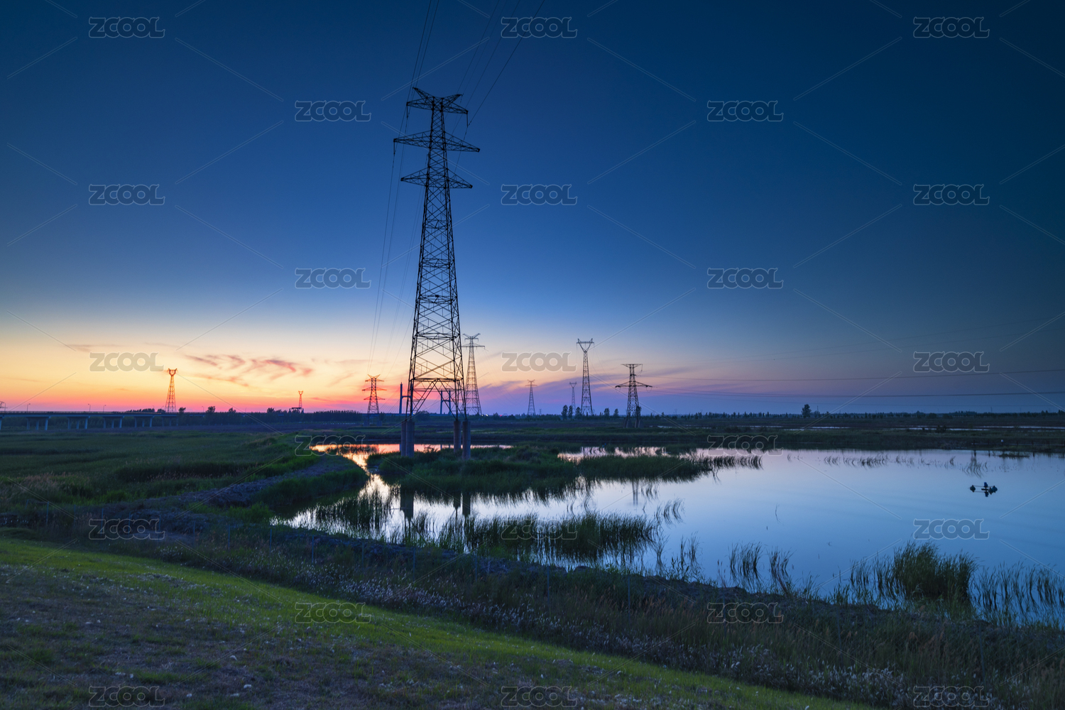 中國山東東營勝利油田高壓鐵塔在夕陽下的美景