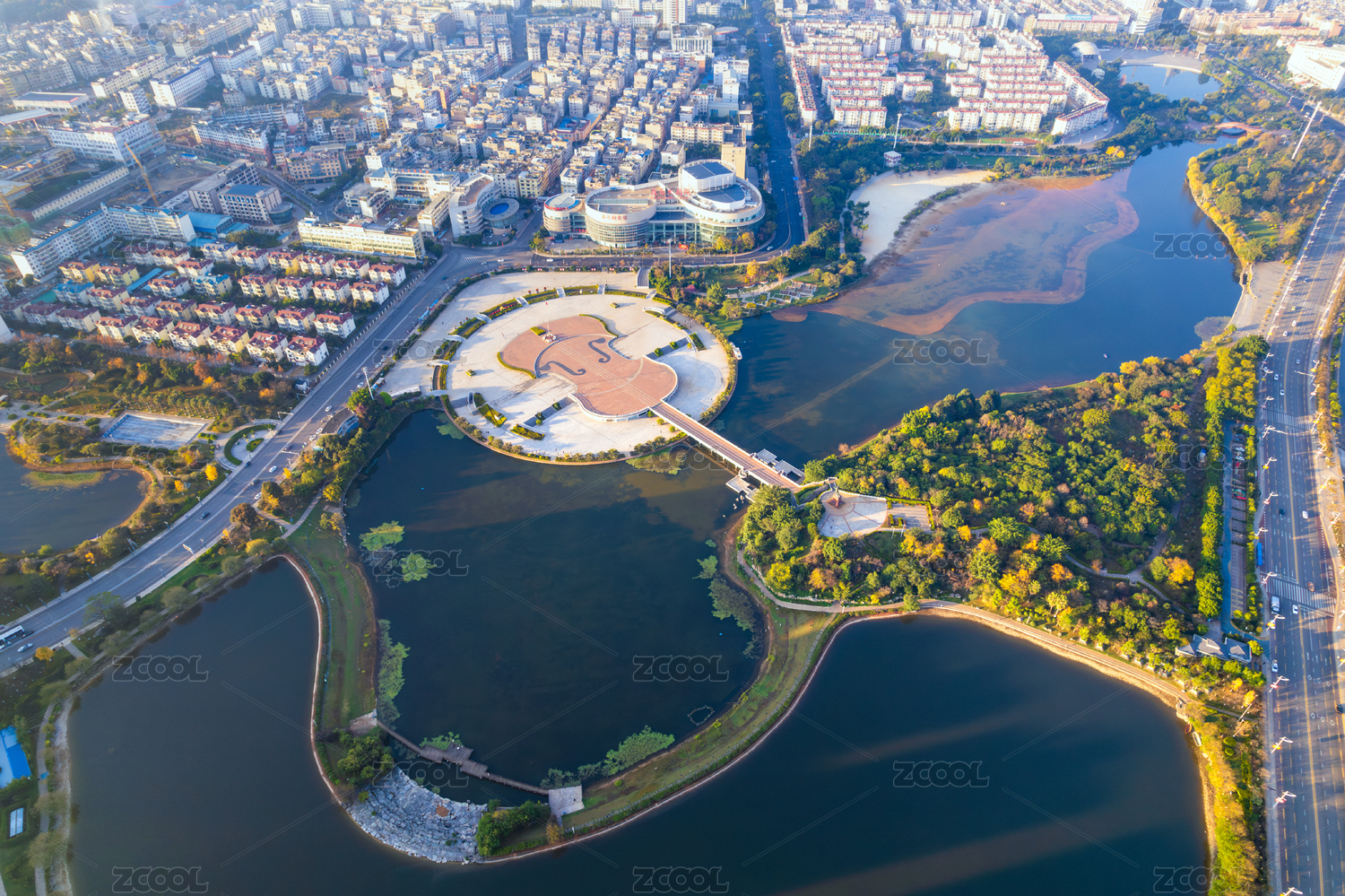 玉溪市紅塔區(qū)聶耳廣場(chǎng)日出清晨城市風(fēng)光航拍