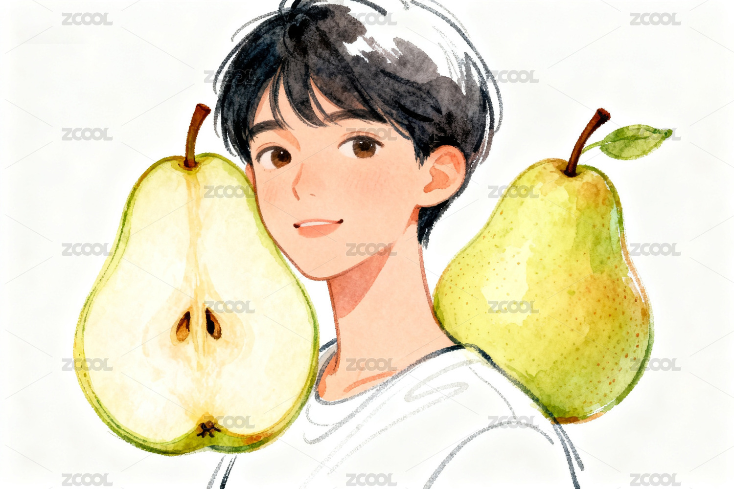 卡通人物手持梨子的插畫