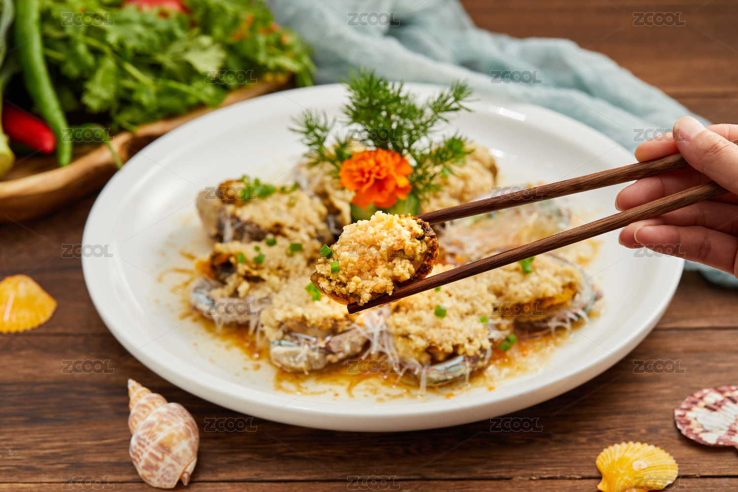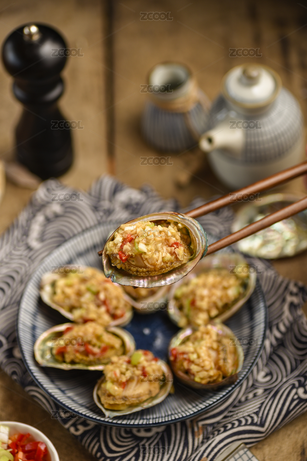 桌上盤里的筷子夾蒜蓉鮑魚特寫鏡頭