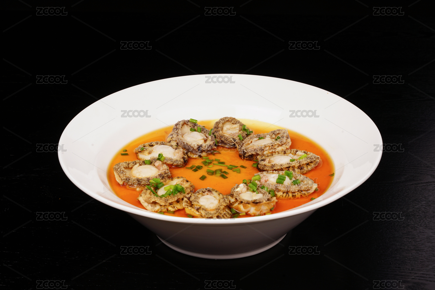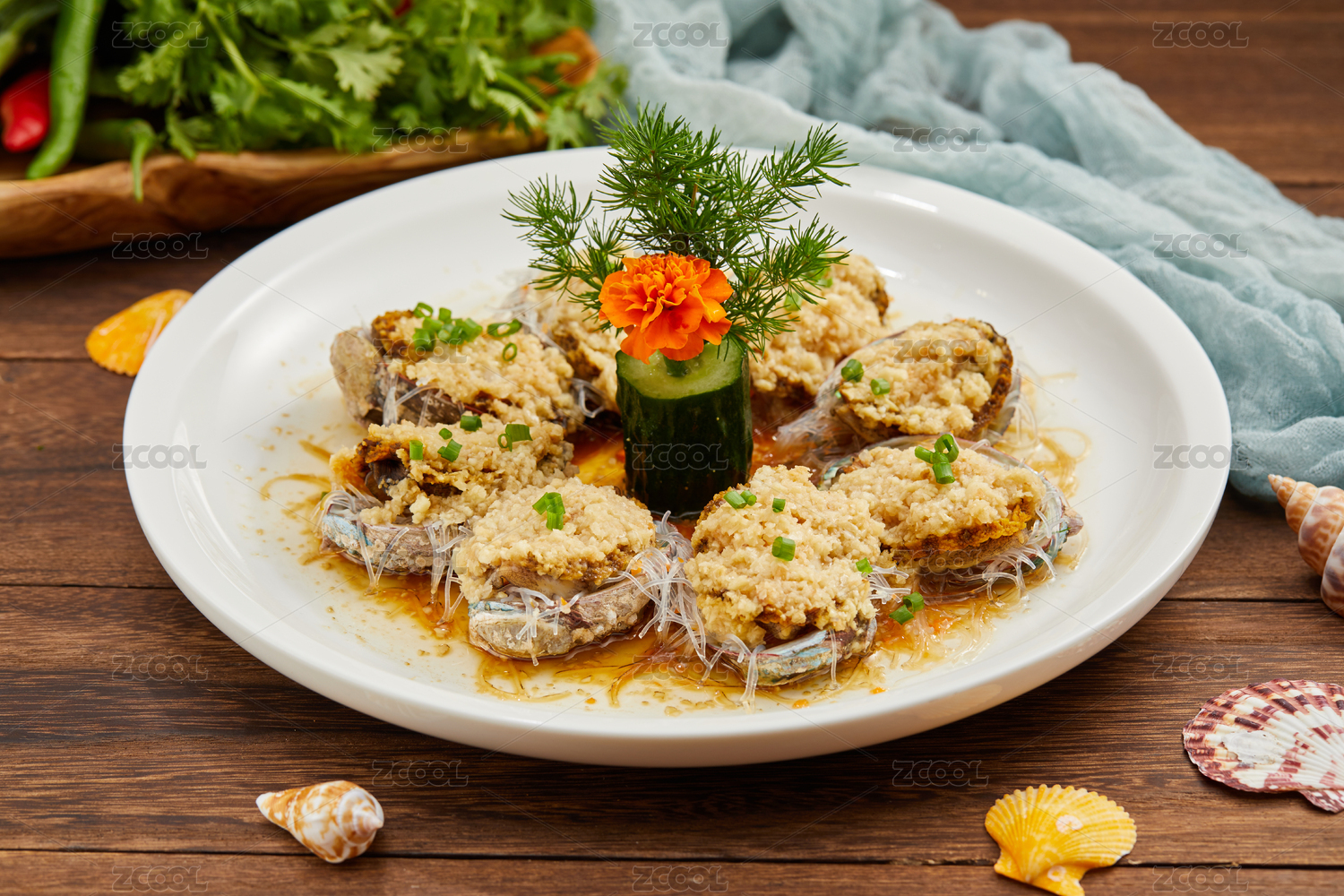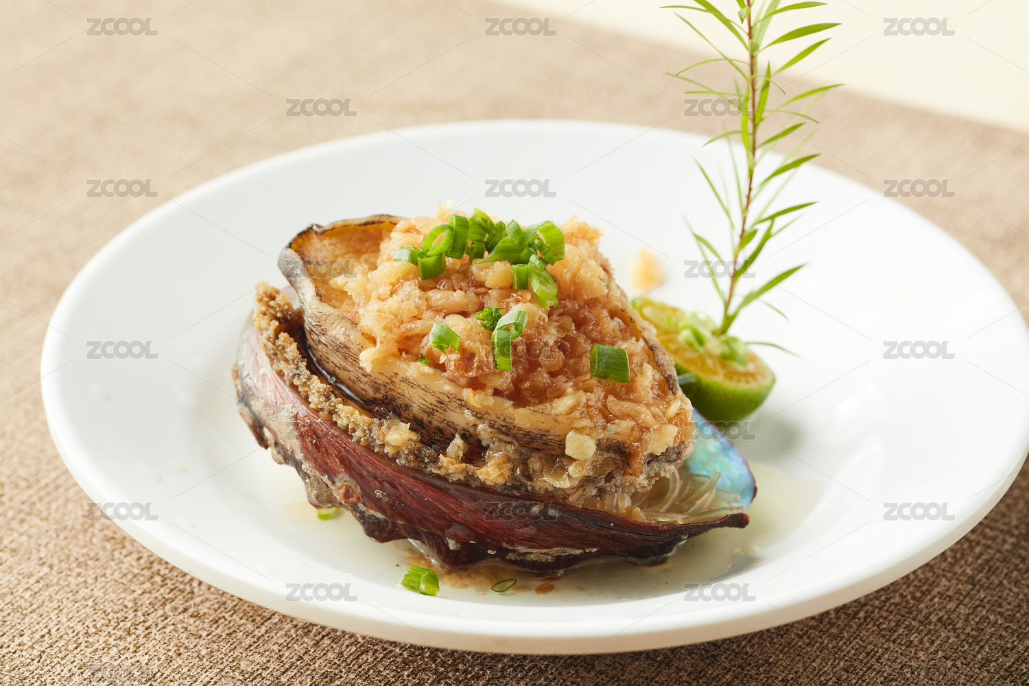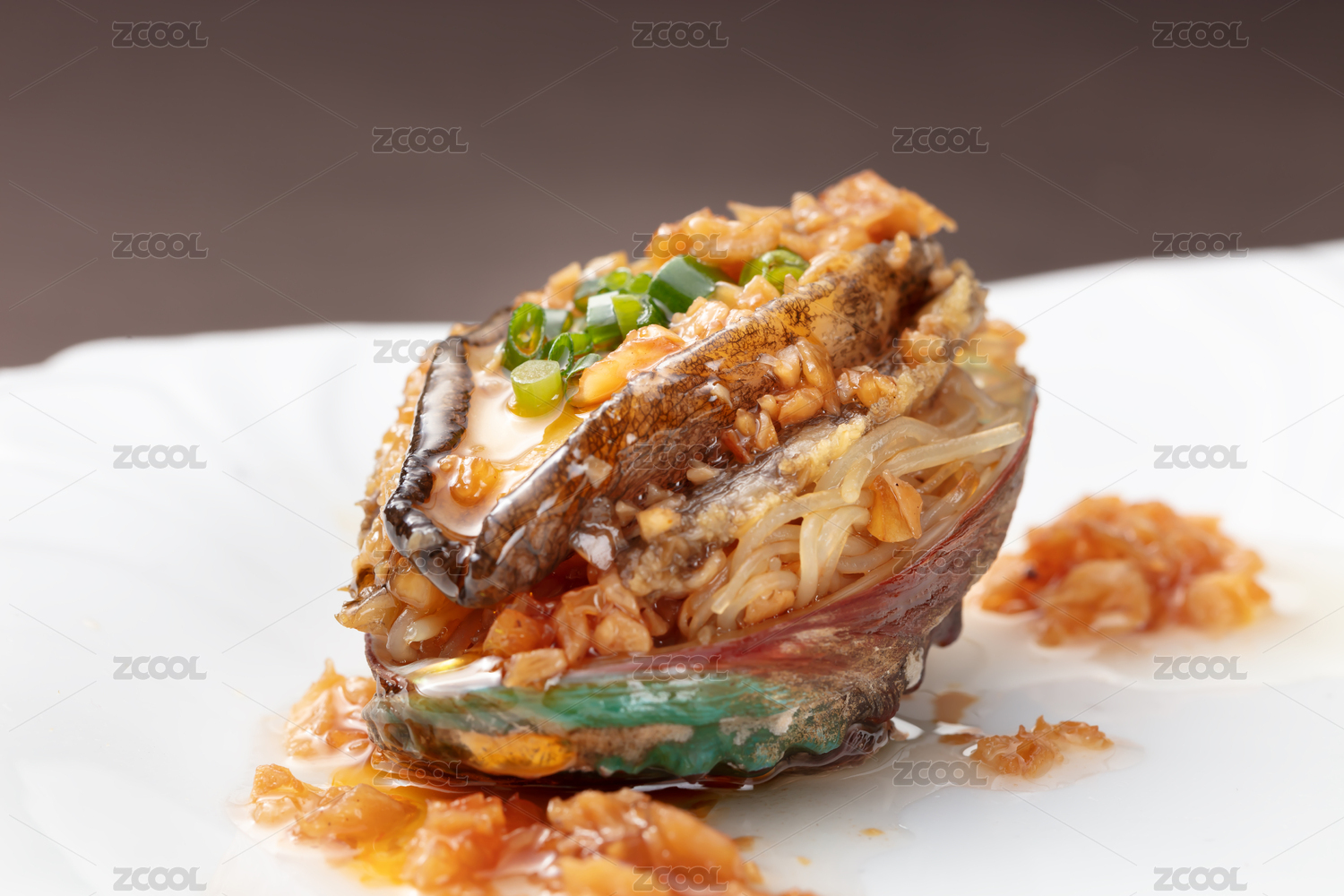 白盤里的粵菜廣式澆汁粉絲蒜蓉鮑魚