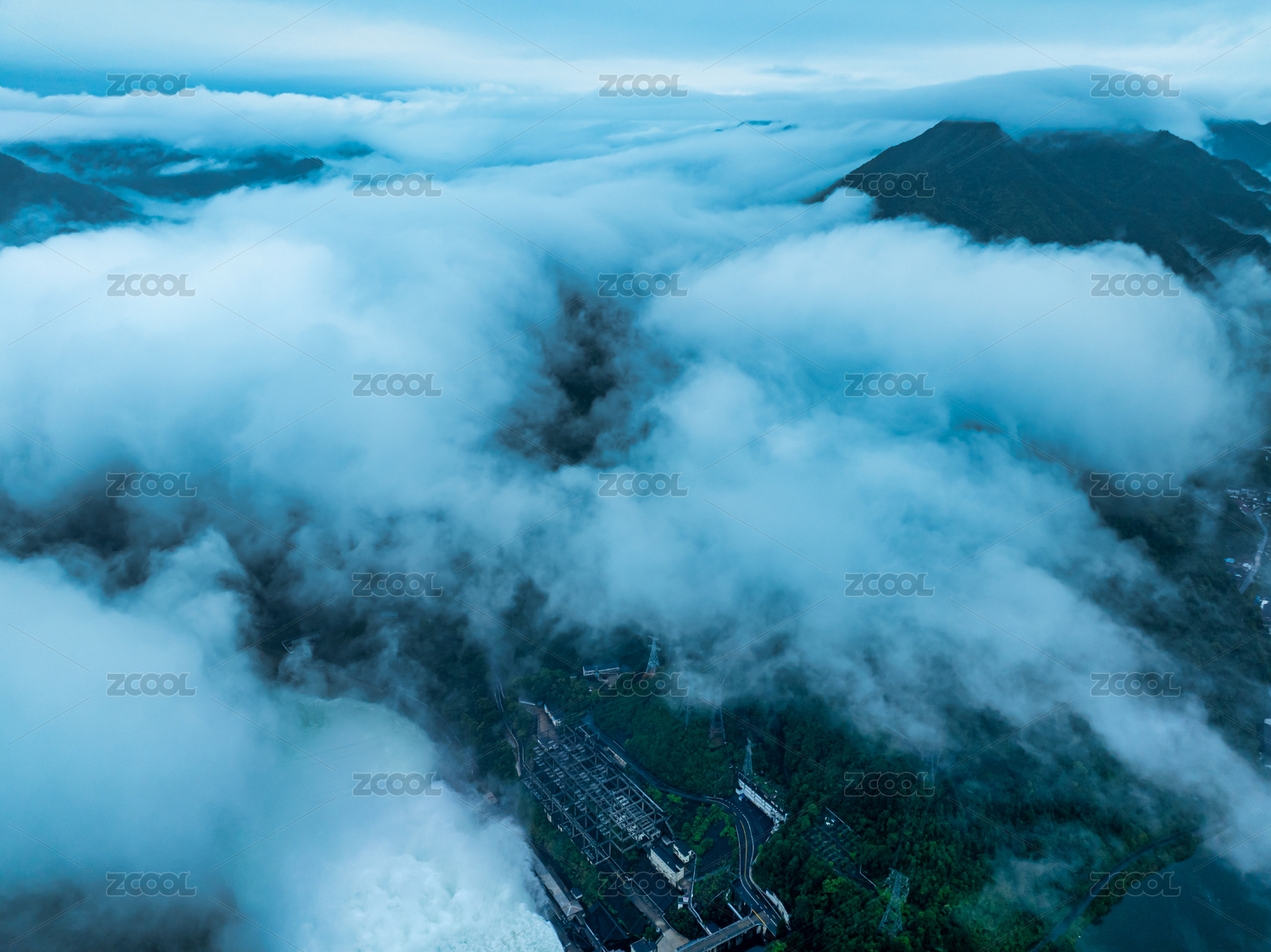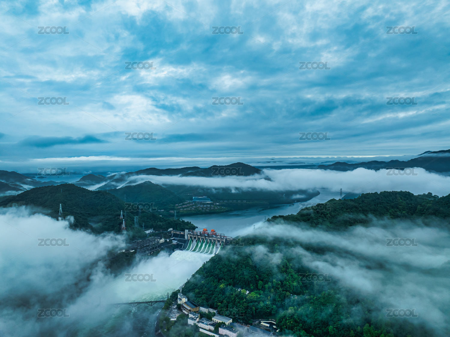云霧中的浙江新安江水電站航拍