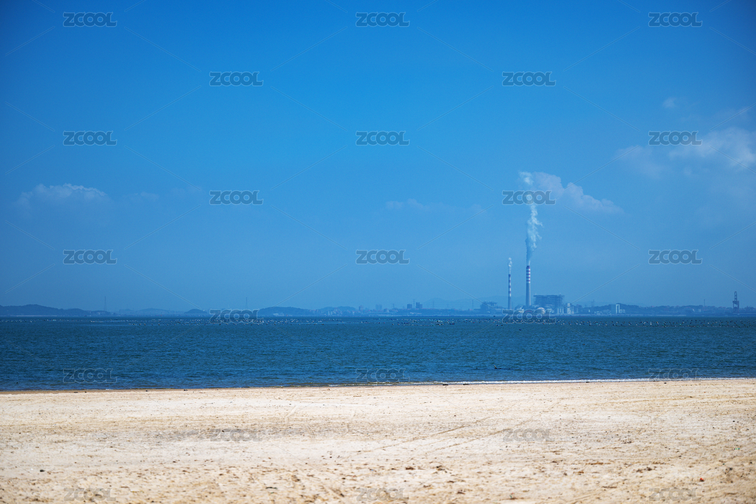 福建省泉州市泉港區(qū)海邊沙灘與遠(yuǎn)處工業(yè)煙囪