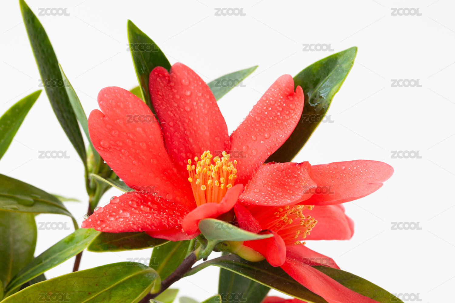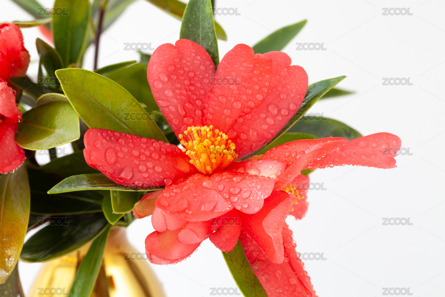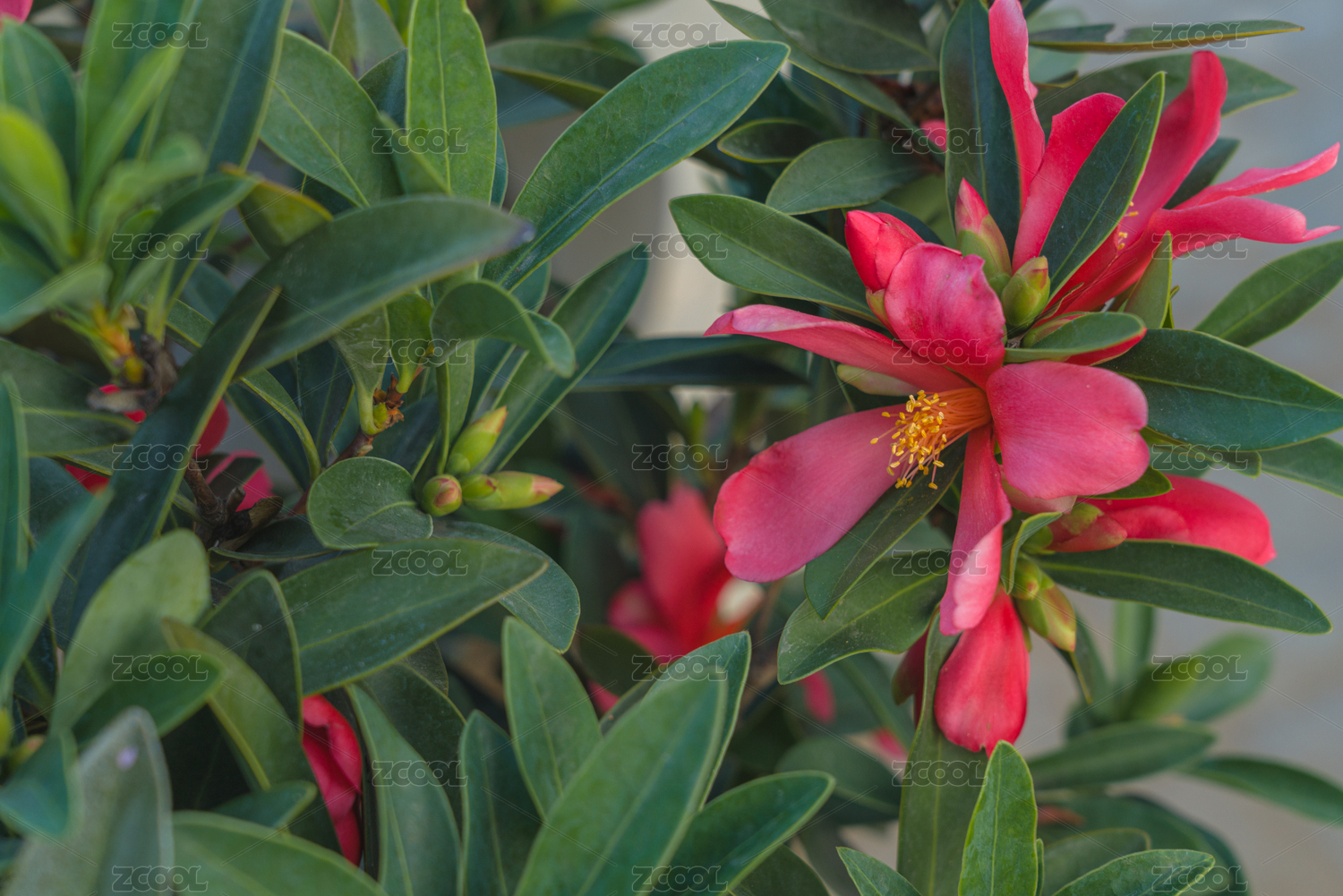 花紅葉綠的毛蕊紅山茶花特寫