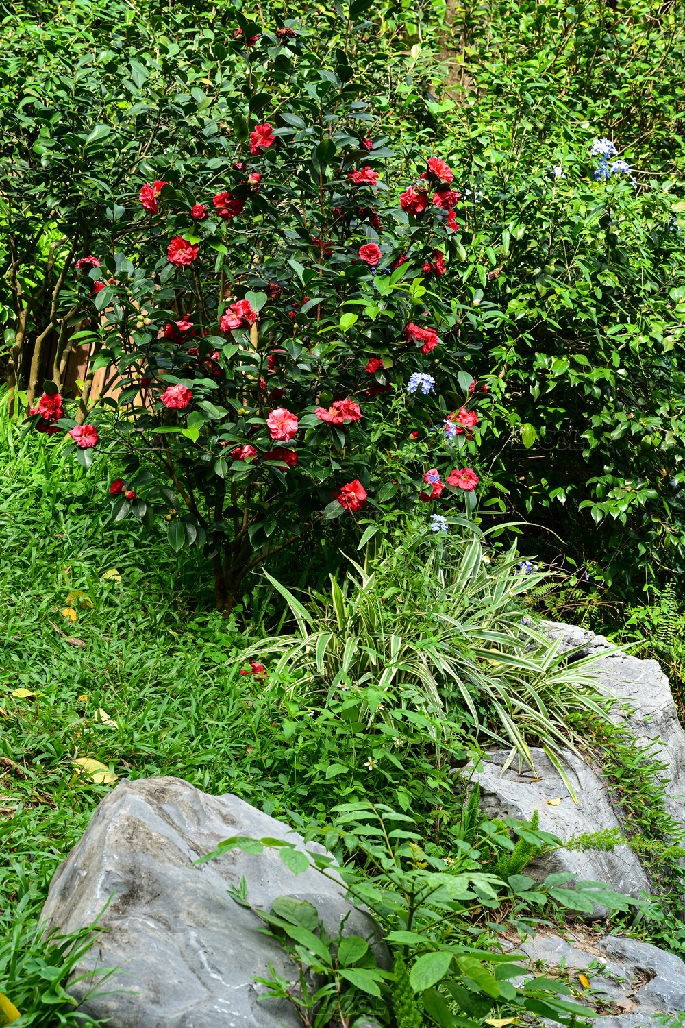 陽光下山石間盛開的紅色山茶花綠植景觀