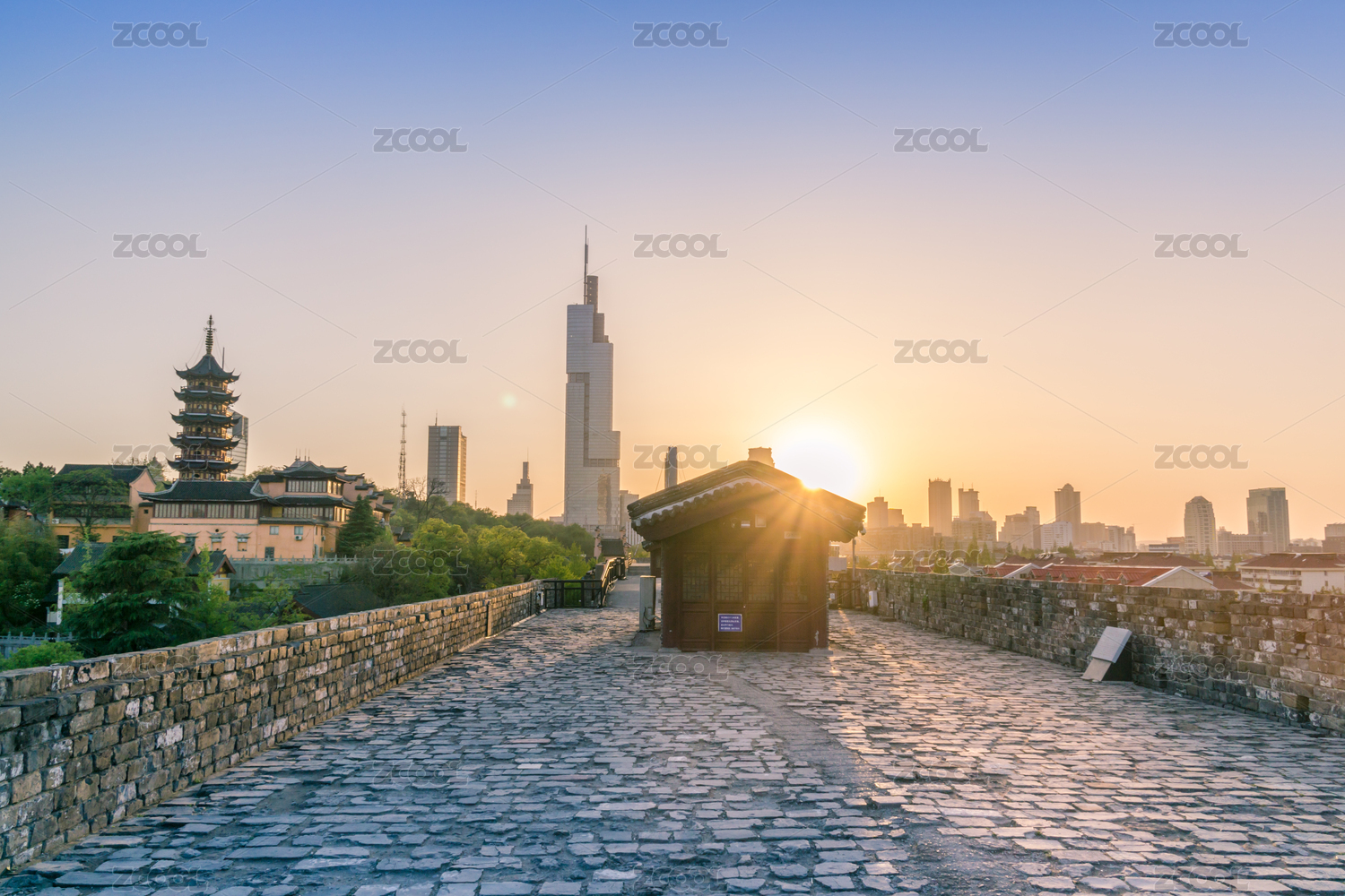 日落下的明代城墻與古代寺廟以及CBD