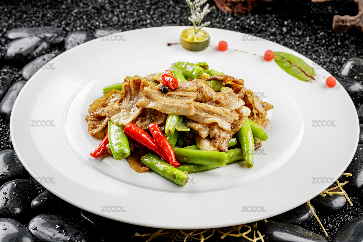 白色圓盤裝的湘味小炒肉擺在鵝卵石上