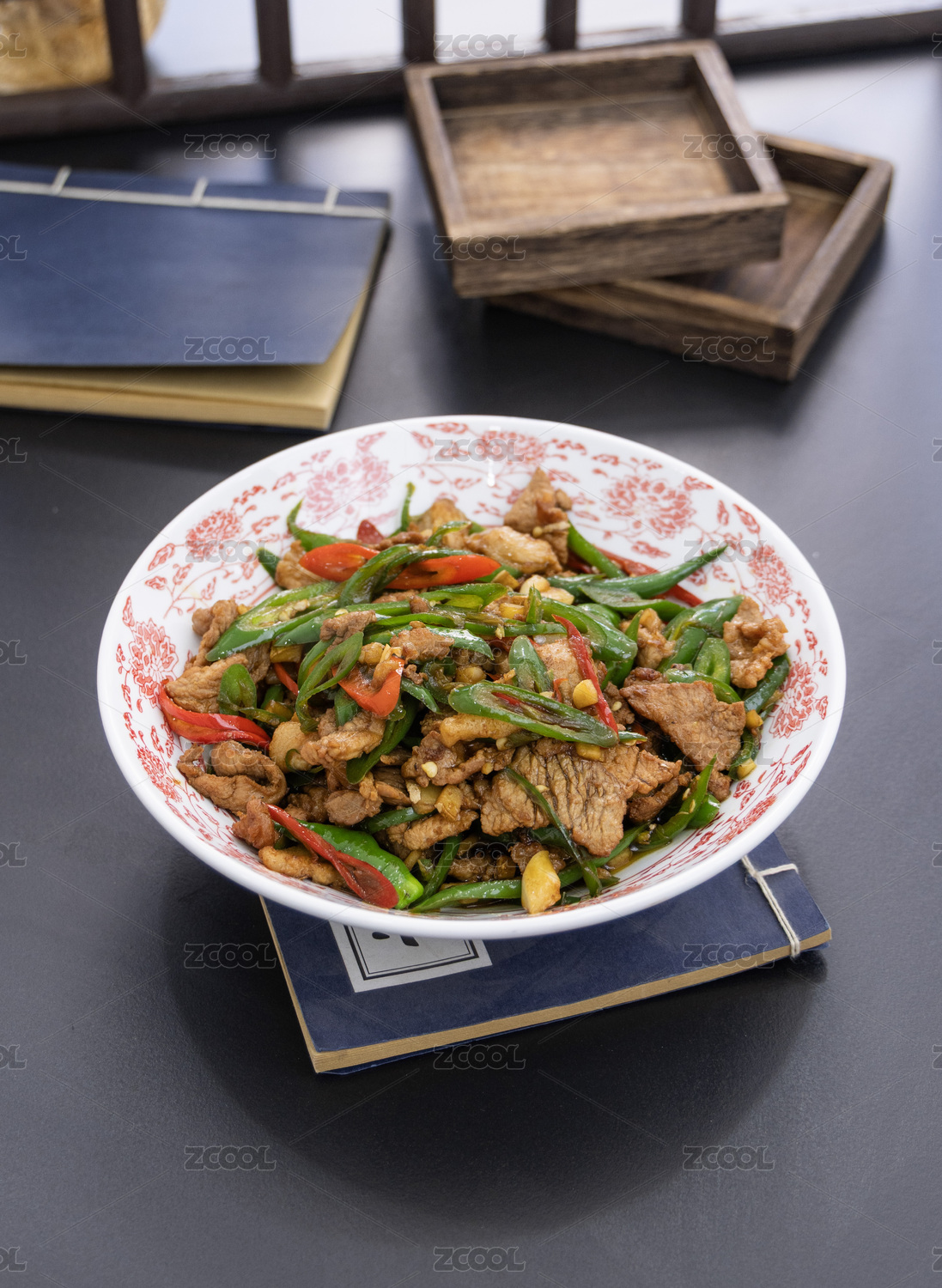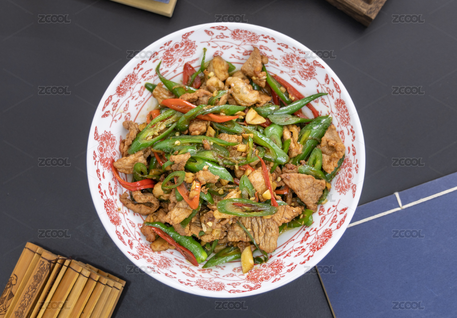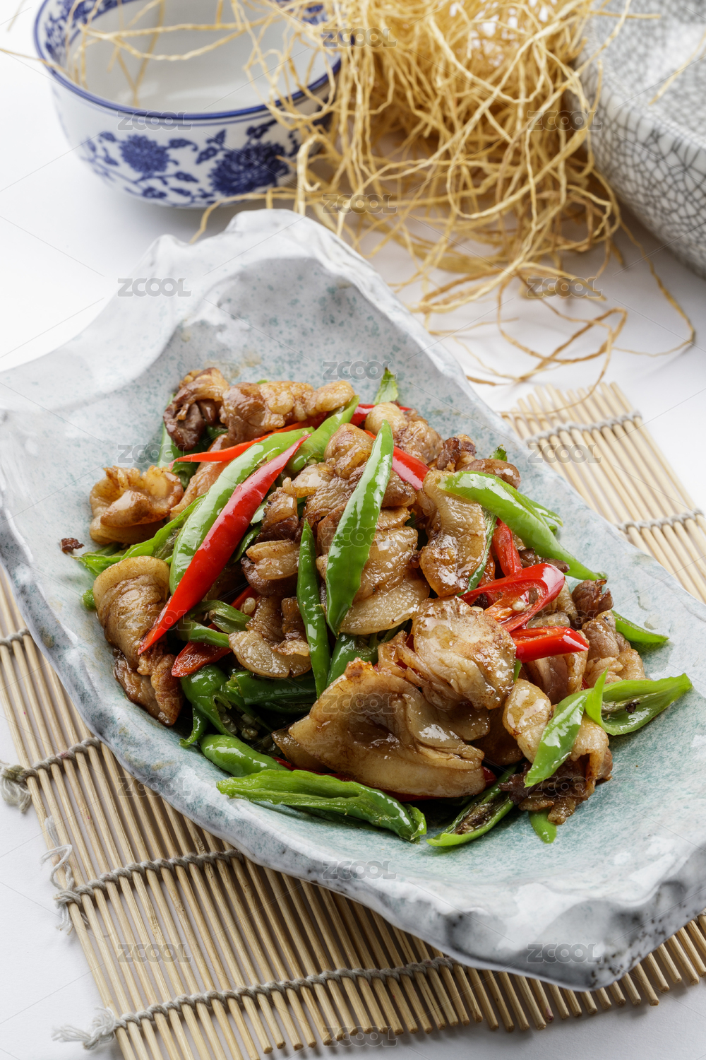 青瓷盤裝的湘味小炒肉擺放在壽司簾上