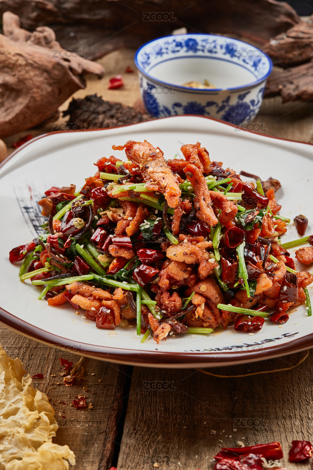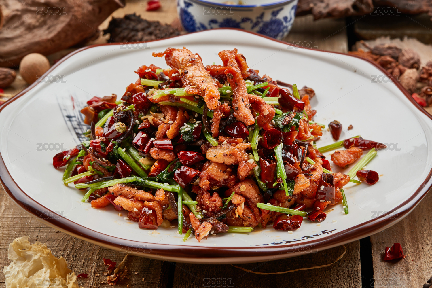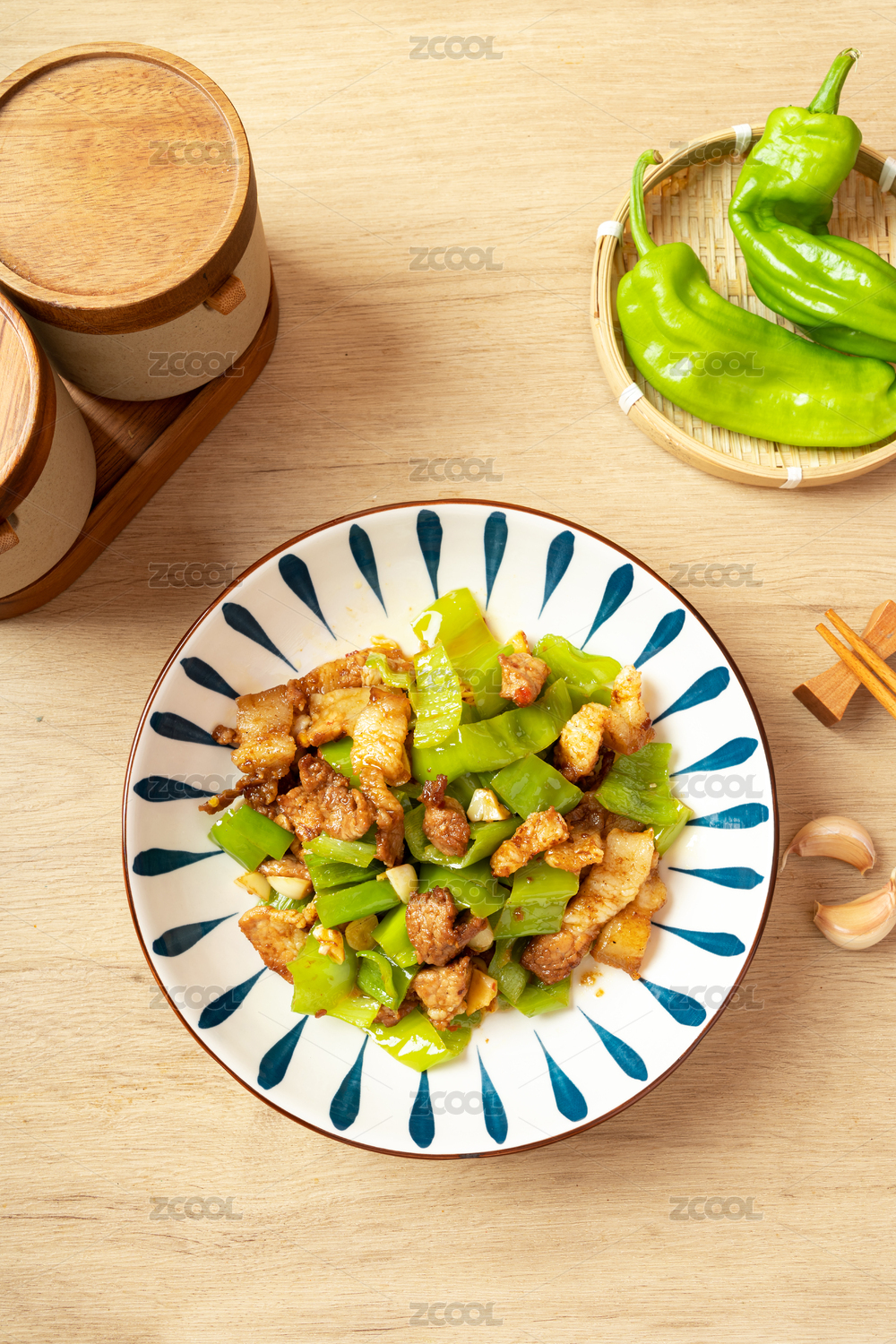 青瓷盤裝的湘味小炒肉擺放在壽司簾上