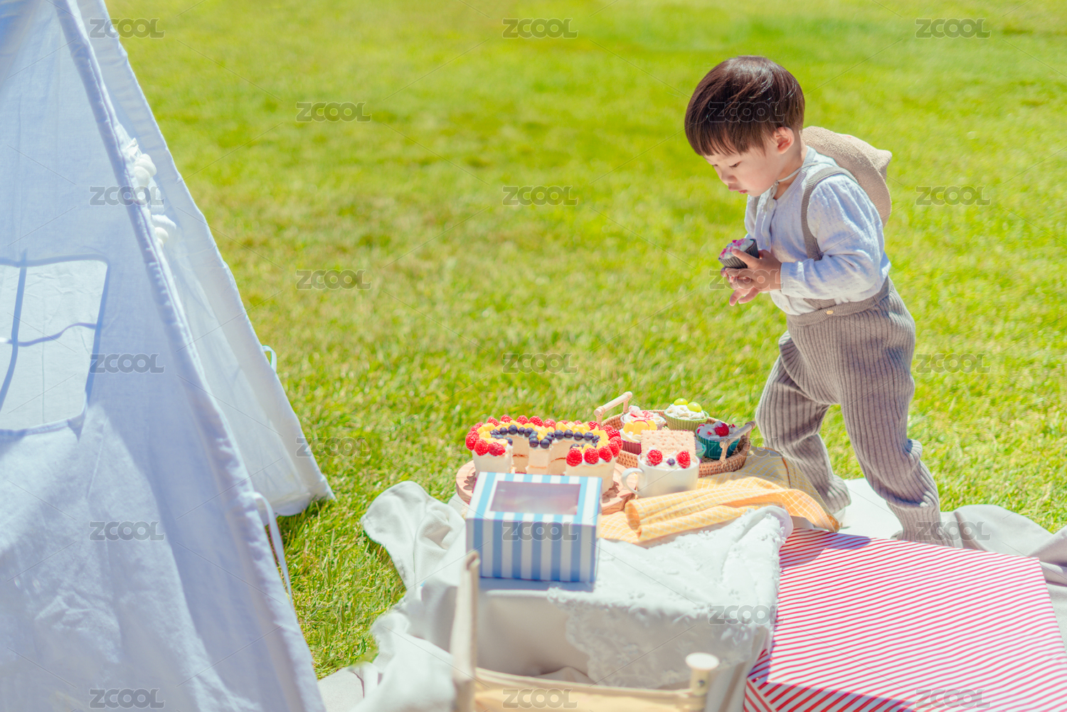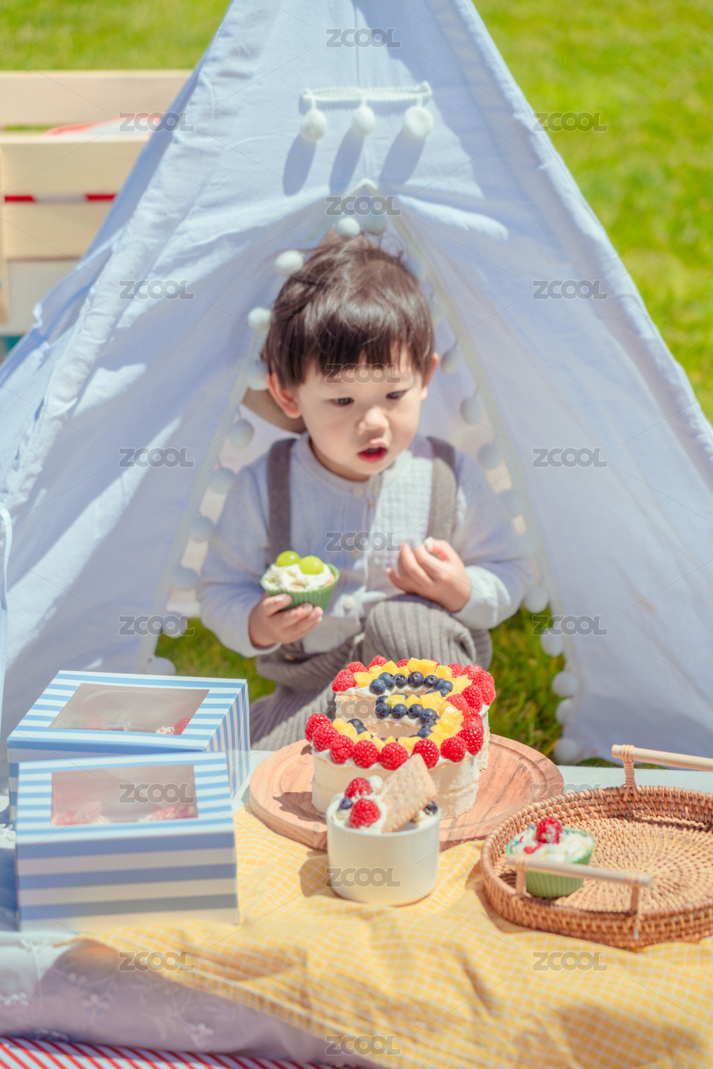 野外草坪上小壽星享受吃生日蛋糕的喜悅