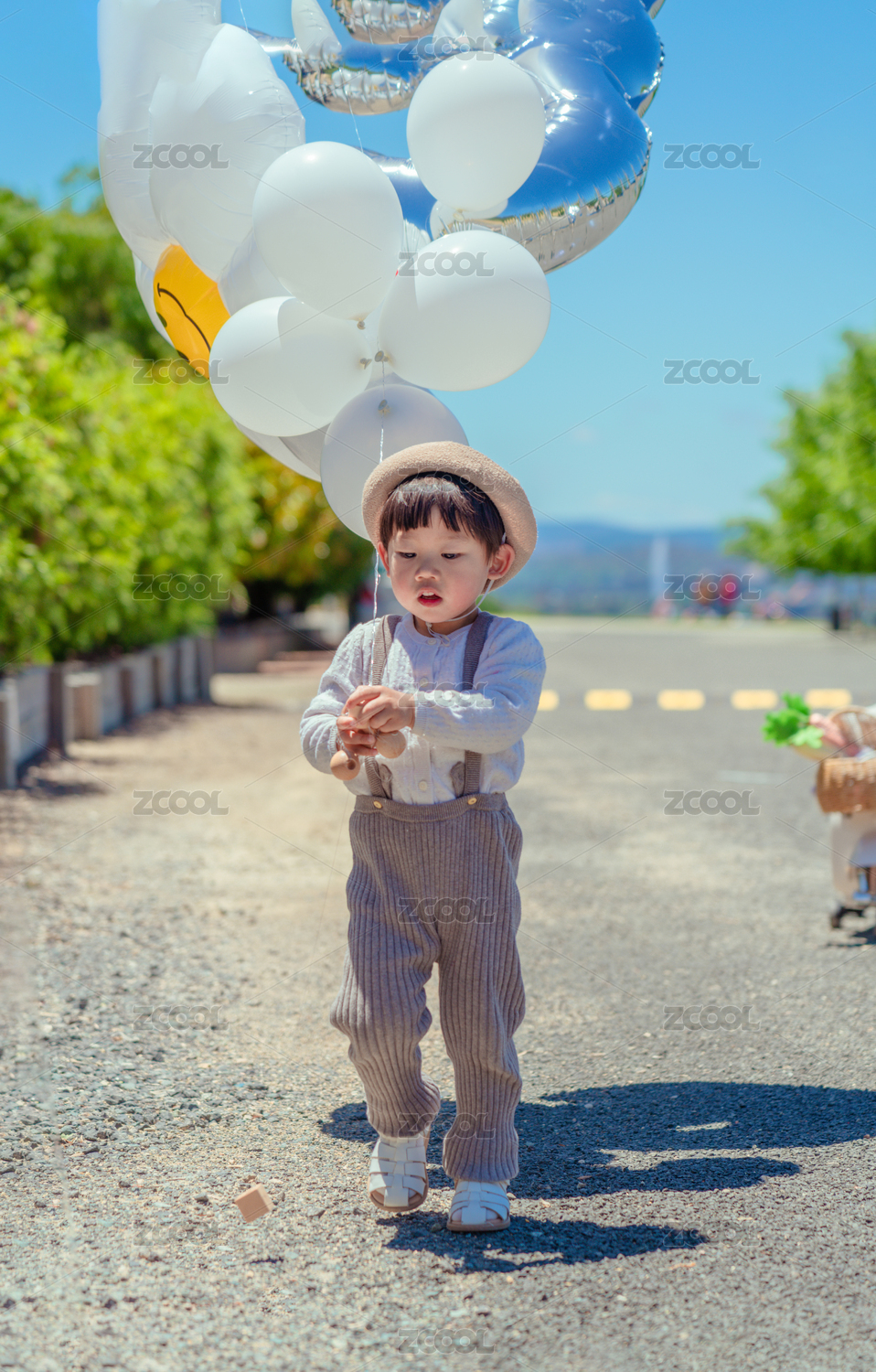 小男孩山坡道上用力拖拉滿載野餐裝備車