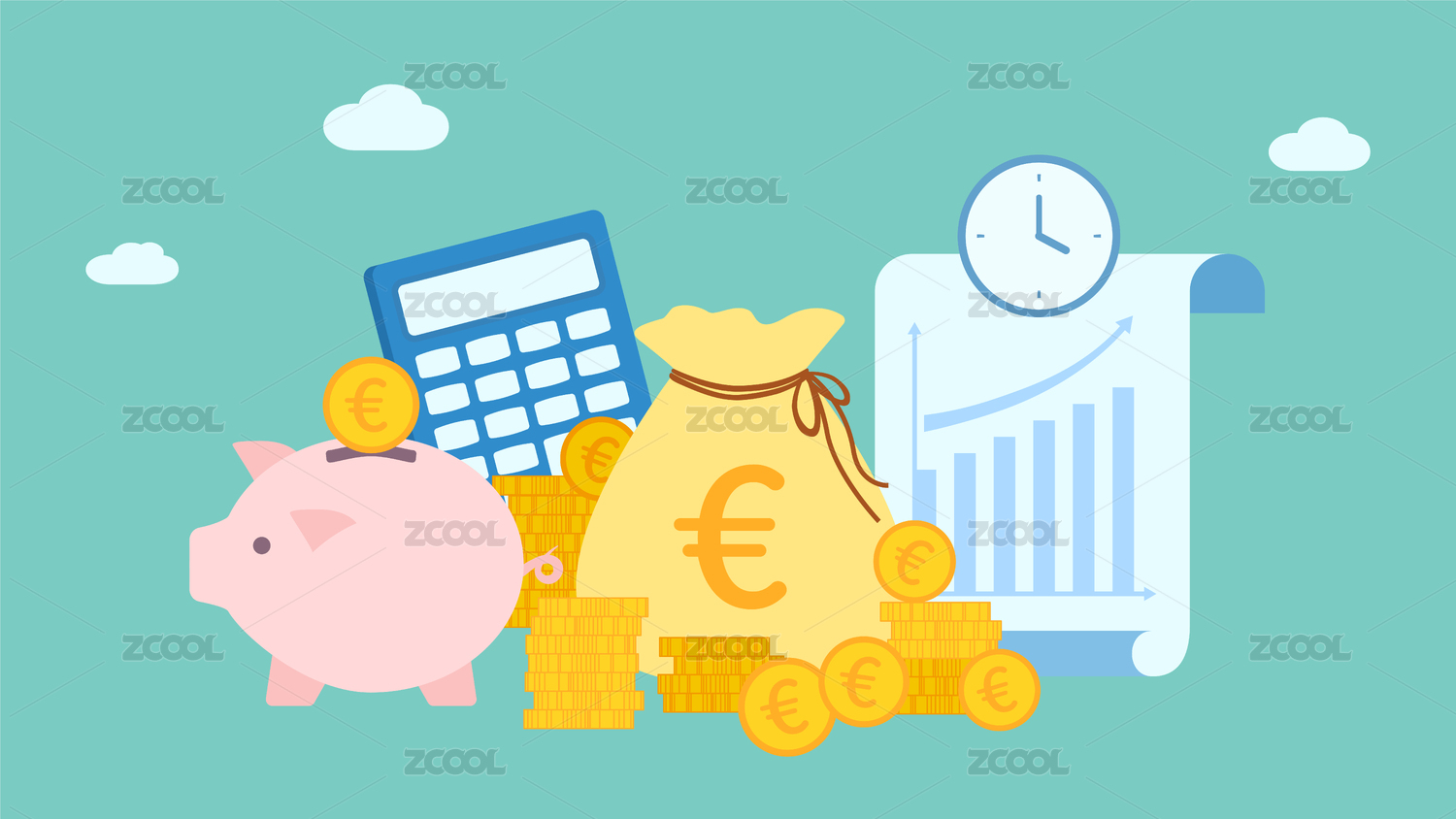 歐元投資理財(cái)金融商業(yè)插畫(huà)小豬錢(qián)罐金幣錢(qián)袋