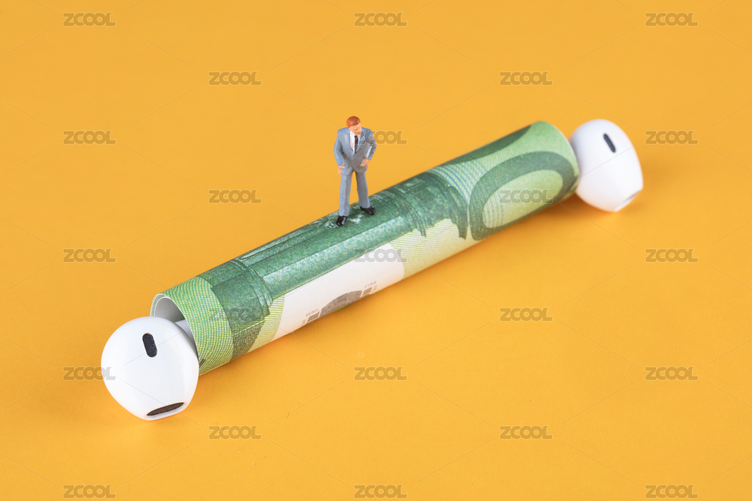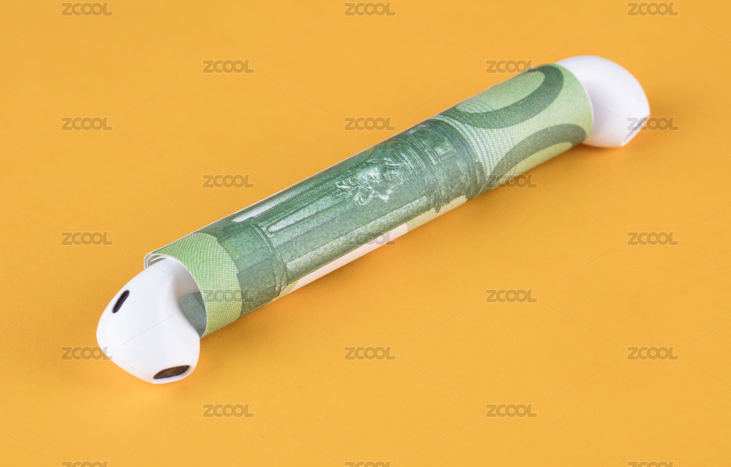 卷著的歐元鈔票兩頭各放一個(gè)藍(lán)牙耳機(jī)