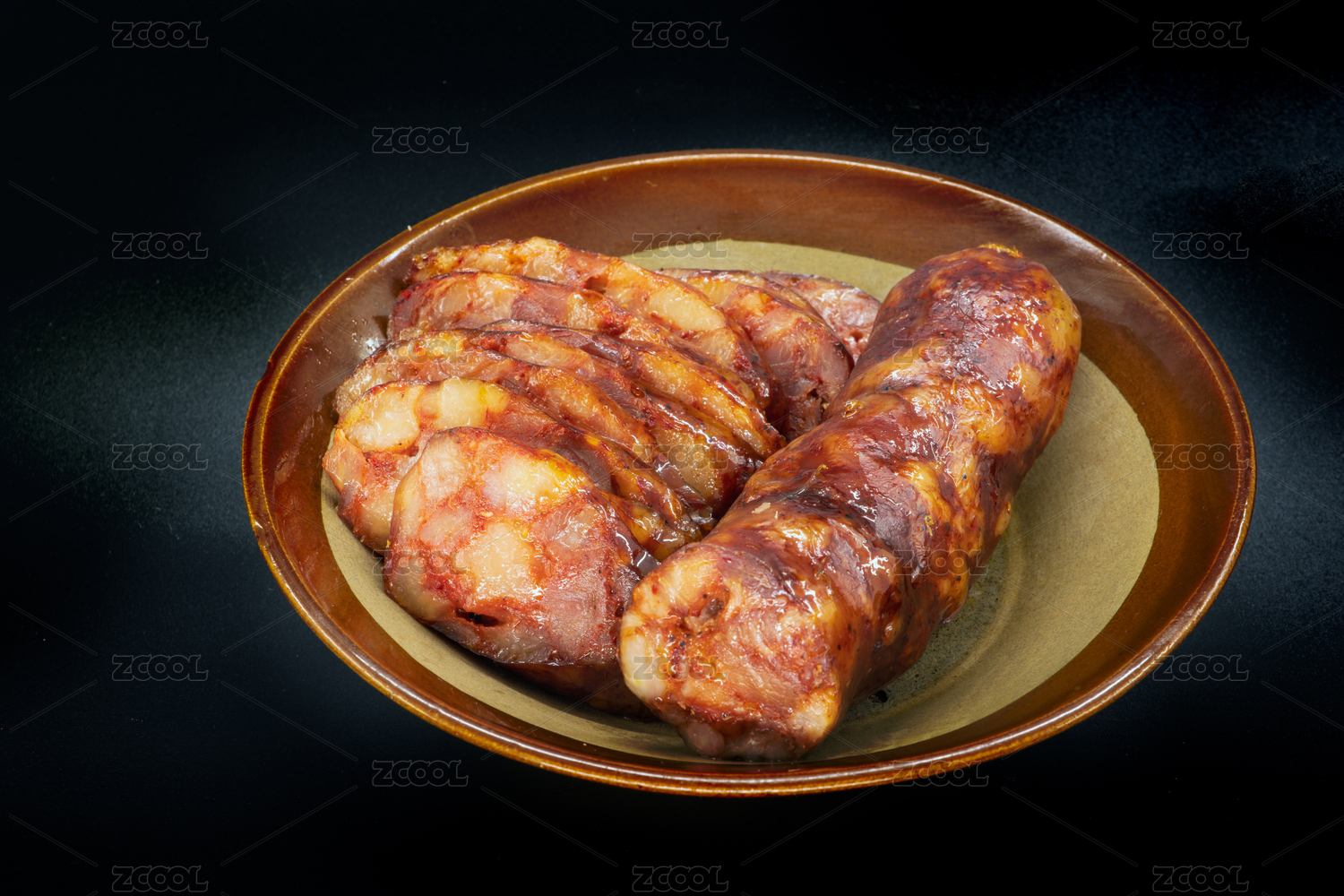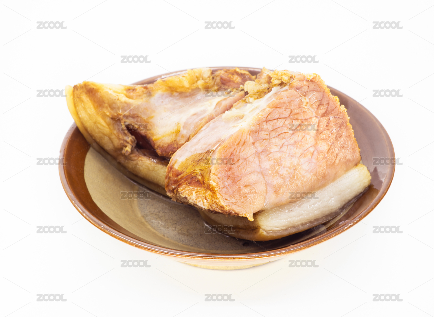 白色背景陶瓷土碗里的兩塊煮熟的臘肉