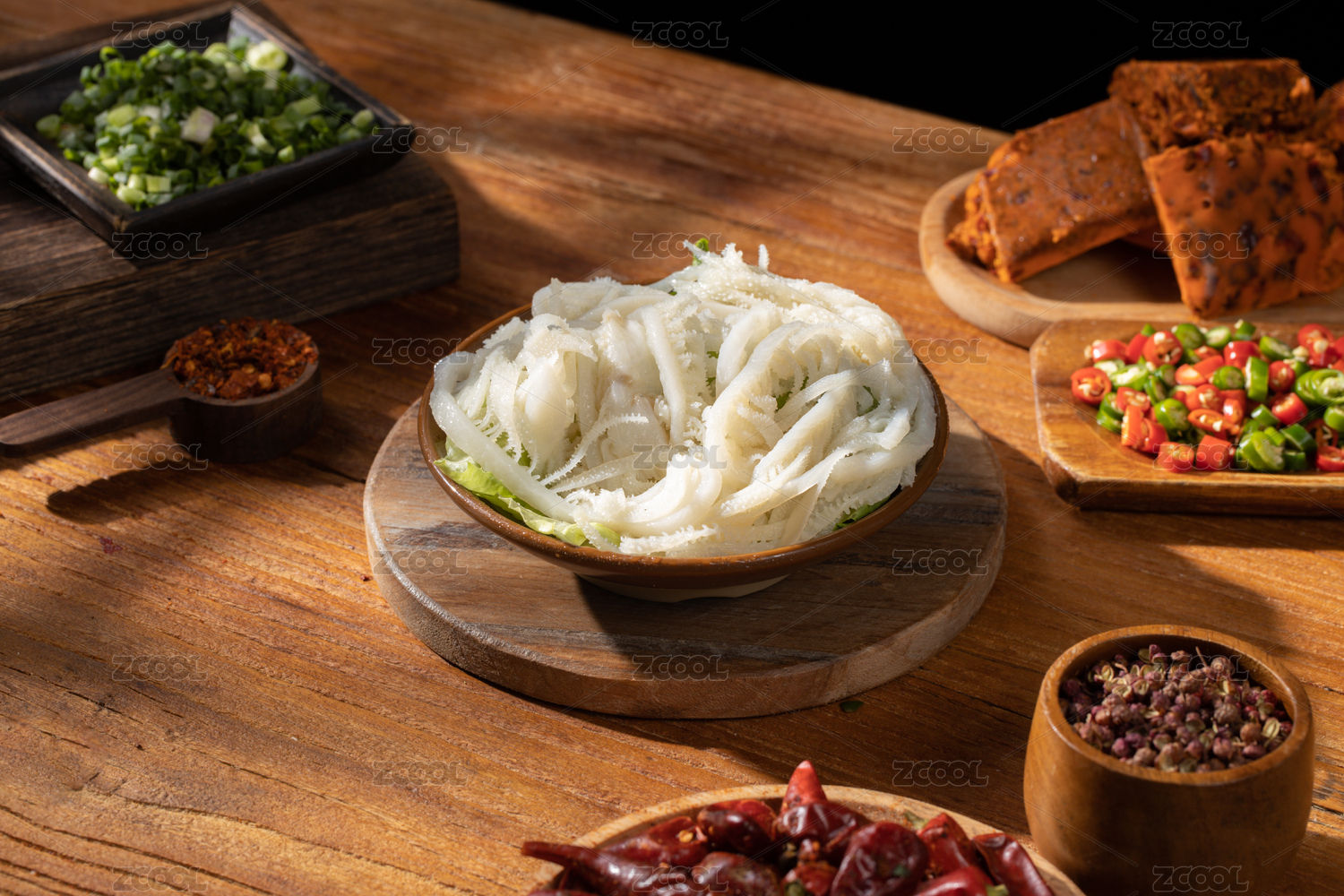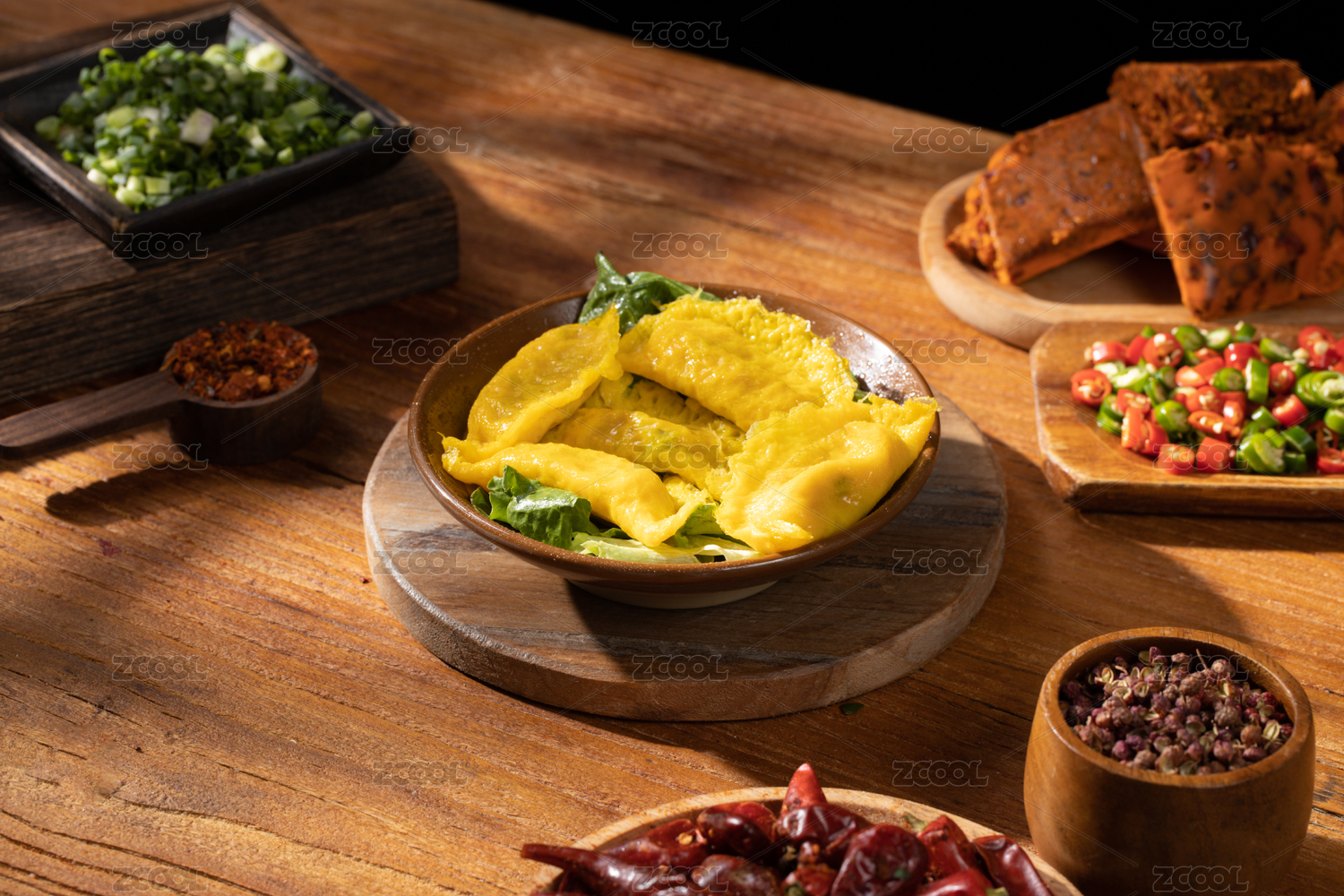 老桌土碗里的重慶火鍋菜品生切土豆片