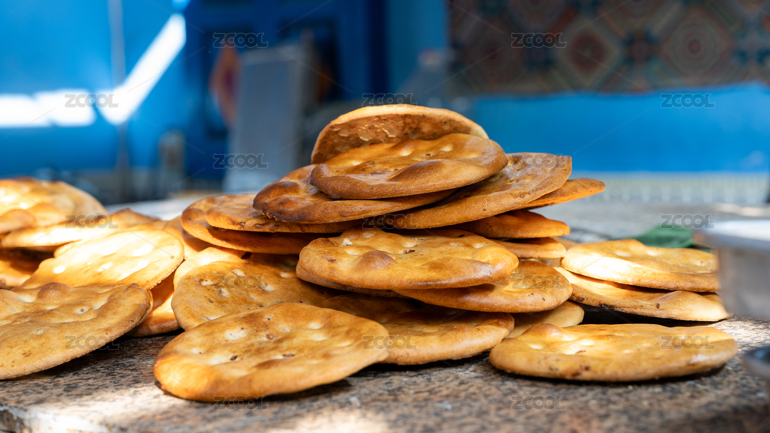 藍(lán)色背景下堆疊的中國新疆傳統(tǒng)食物馕餅