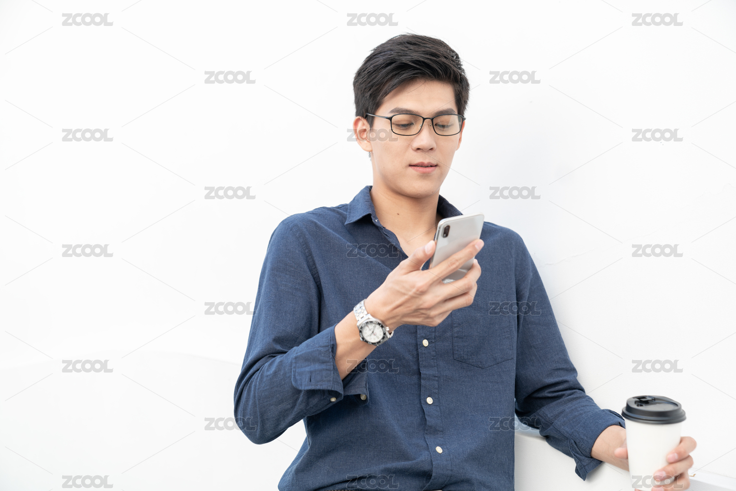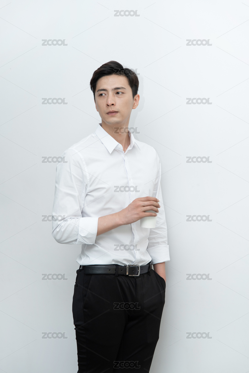 站在白墻邊端著咖啡休息的年輕商務(wù)男士